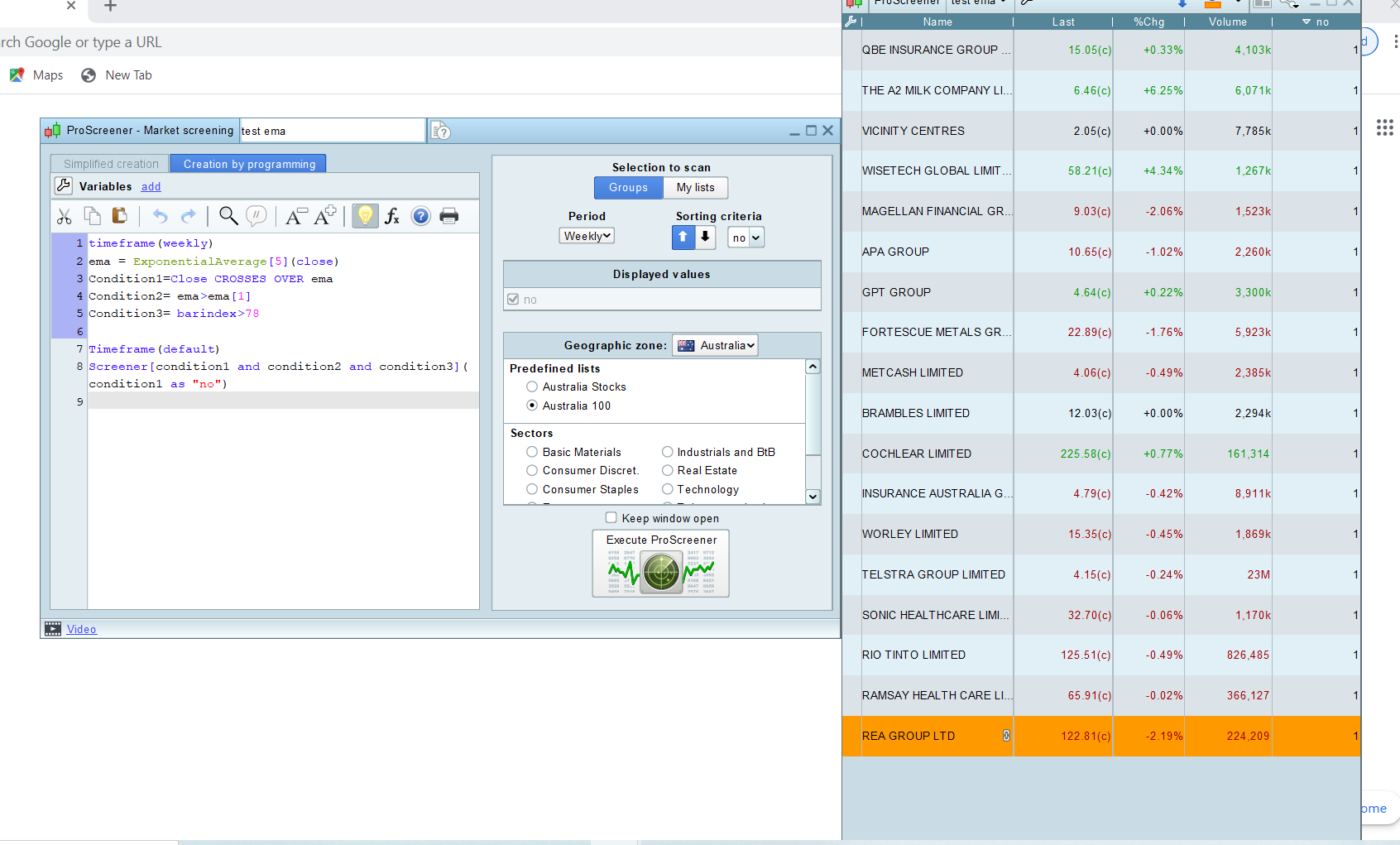 I have attached a couple of screenshots showing the code and the results that the screener gives. I have included a screen shot of Magellan (MFG). It doesn’t meet the requirements of the scanner but is on the list. Vicinity(VCX) and APA(APA) are some more that appear on the list but don’t meet the requirements.