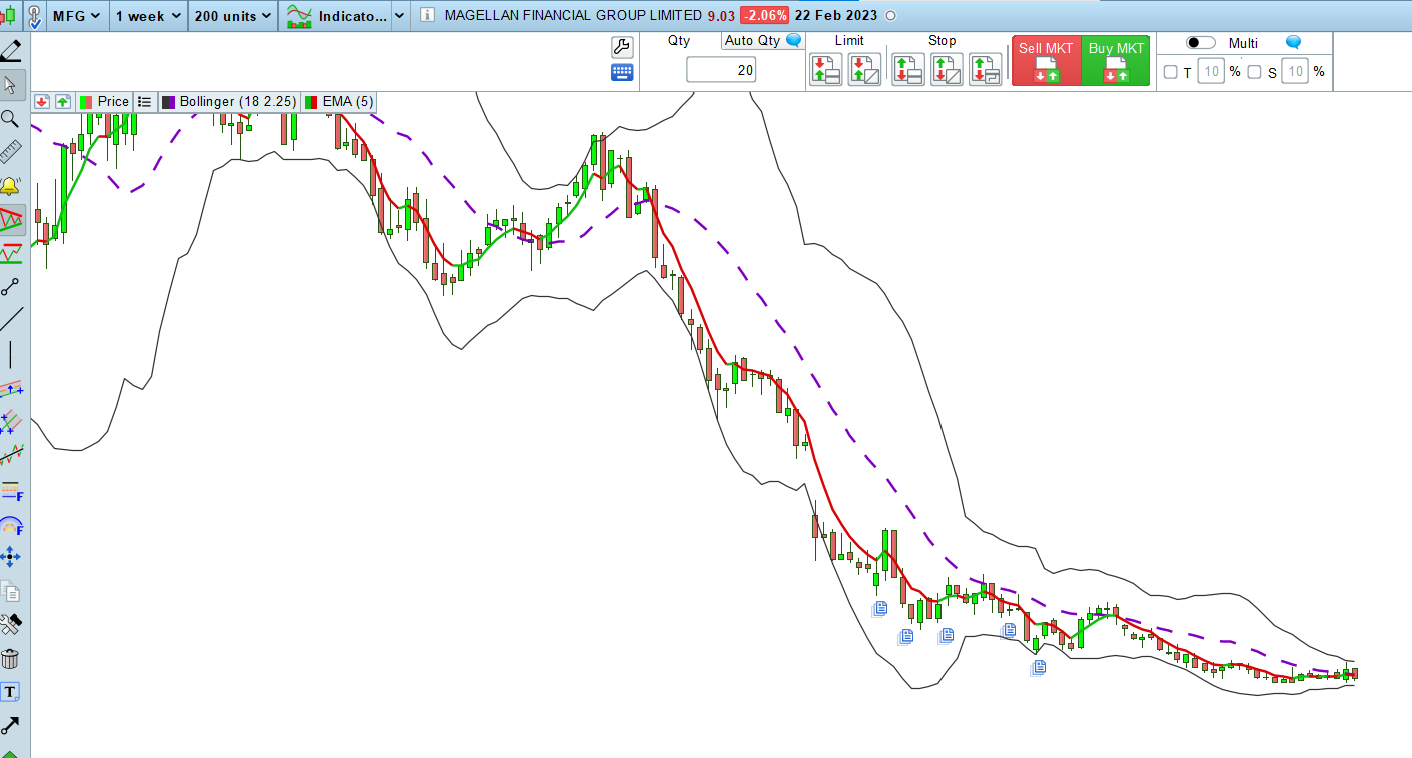 I did a scan and it showed Metcash (MTS – Australian stock) stock as meeting the above. The current price is below the ema on the current(weekly) bar and is below the close of the previous bar. The ema is going down from the previous bar.