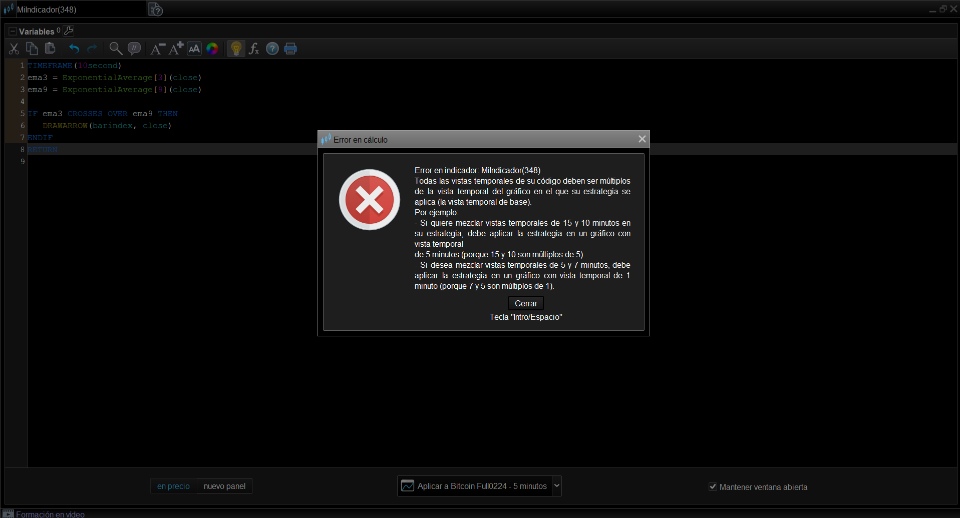 Buenos días, con la nueva actualización ya deja incluir por ejemplo un ema 3 de temporalidad de 10 segundos en la grafica de 5 minutos, pero quiero meterle mas condiciones así que lo querría hacer programando, como podría iniciar el código ya que al meterlo me sale un error de que no deja. Un saludo