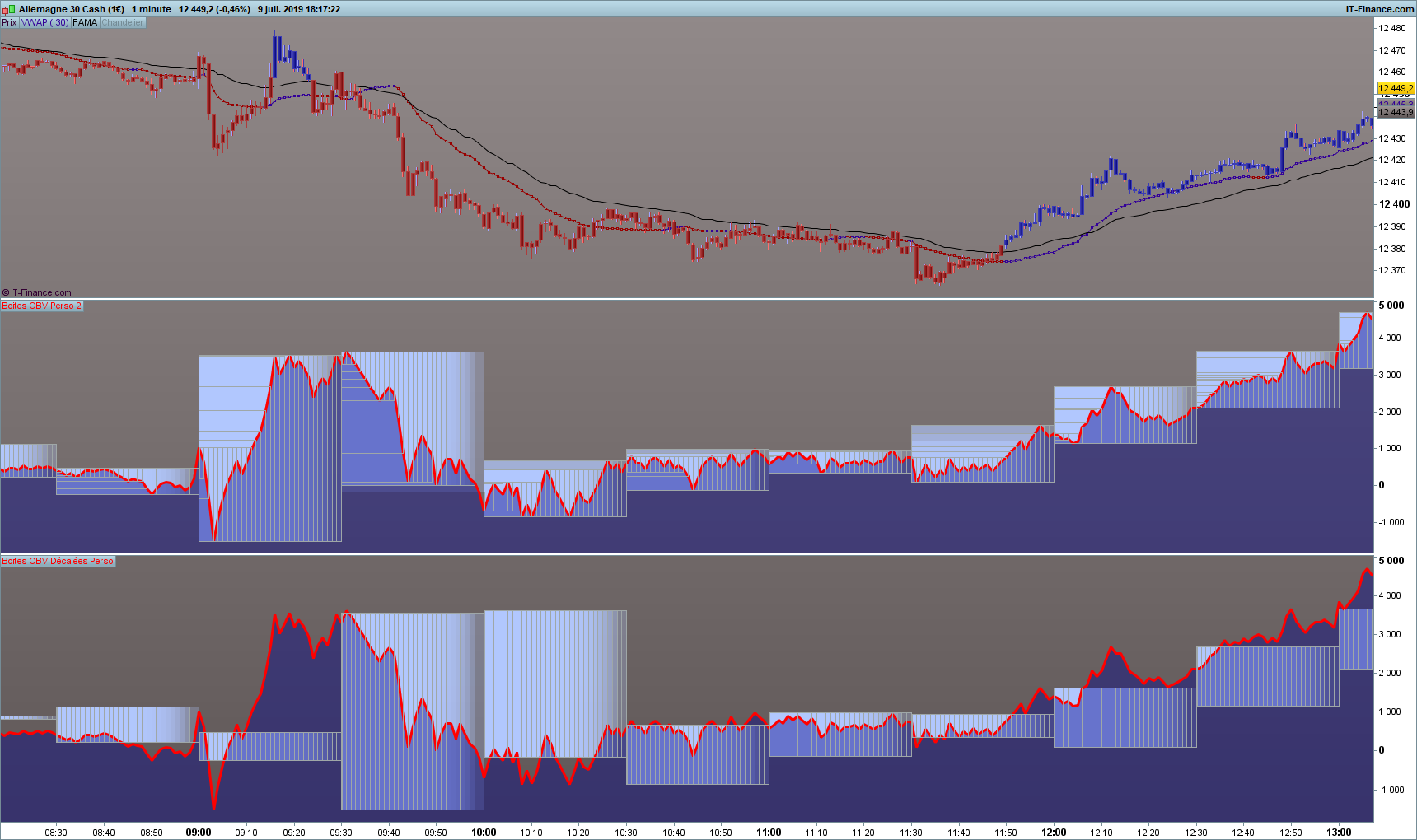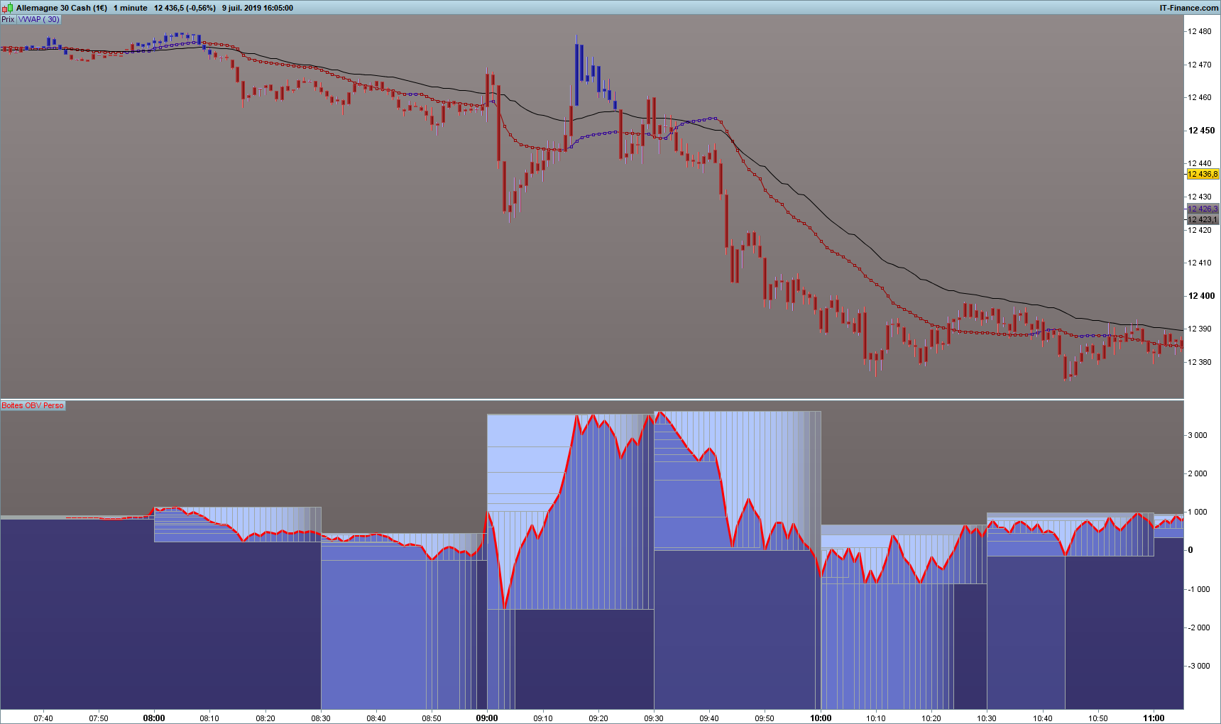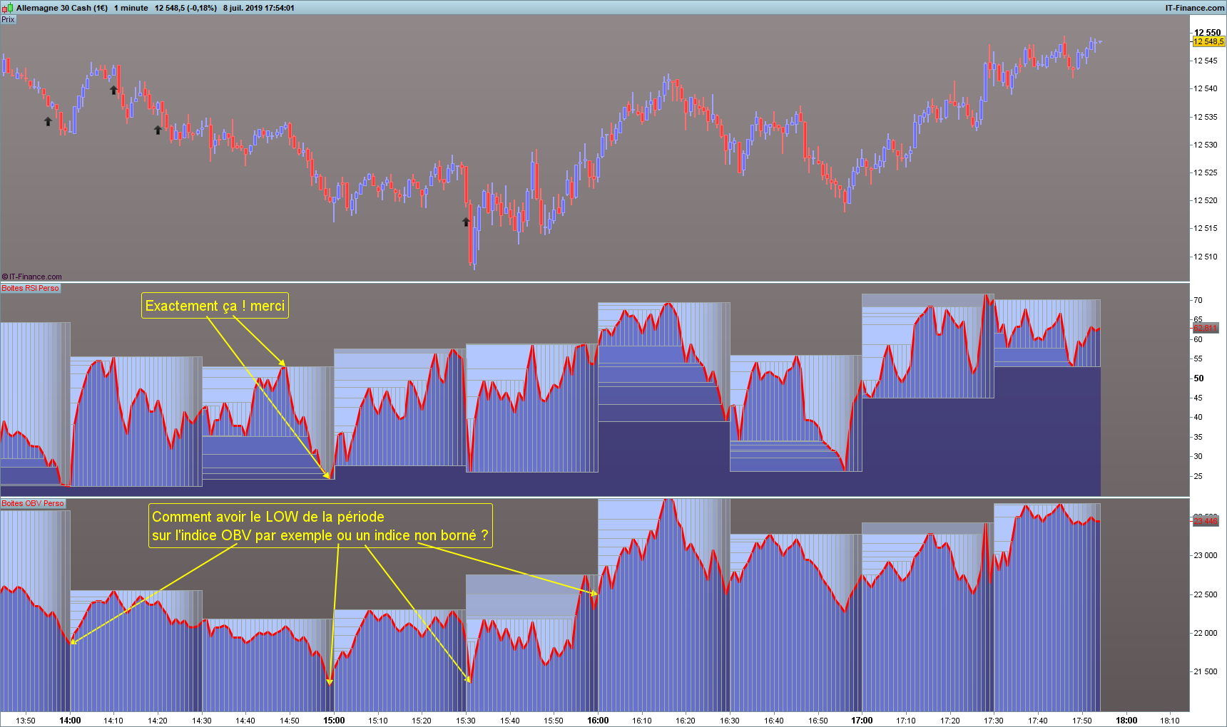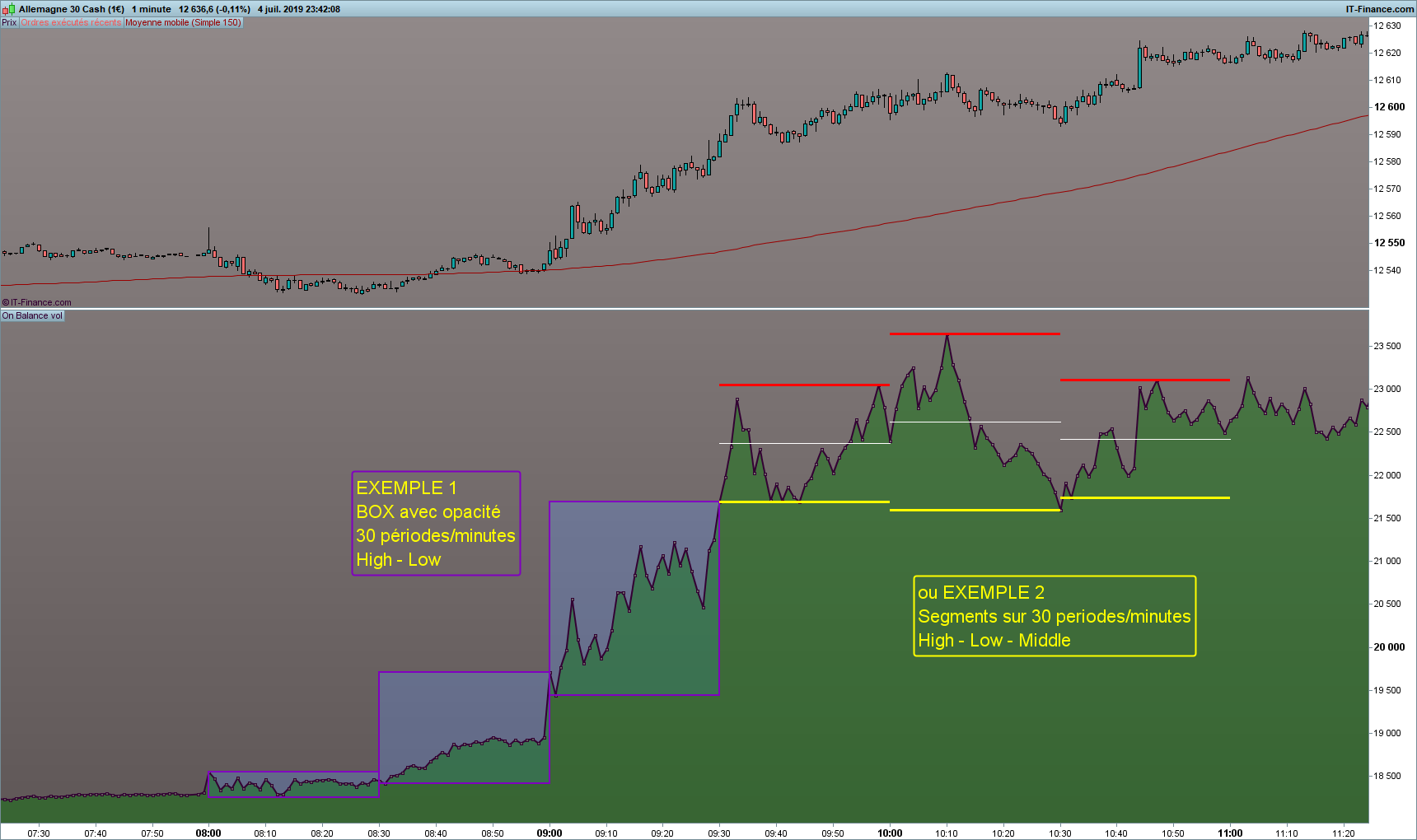 indicateur inférieur OBV avec des “box” sur les “30” dernières minutes et/ou des segments pour exemples.