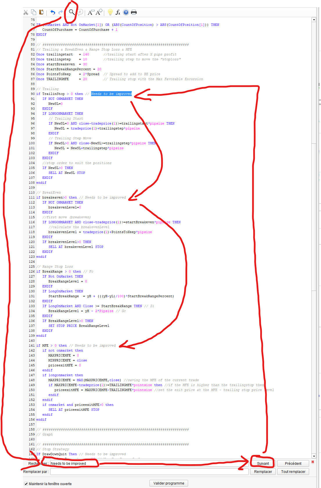 Photo of your code inside an editor window: click on magnifying glass (or click mouse inside code area and press CTRL+F), then let’s say you want to find fast your “needs to be improved” comments not wasting time scrolling, you type it next to “find”/”rechercher”, then click on “next”/suivant, and it will jump from one to the next, and when reaching last one if clicking next again it goes back up to first one.