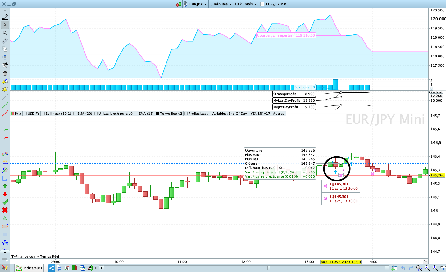 Let’s start today on version 17, I try to control the gains and losses per day in order to compare them to my daily risk which in this example is 10€ with the following variable : MyJPYDayProfit