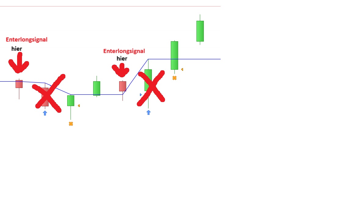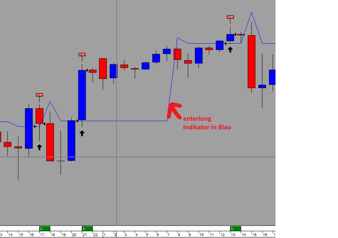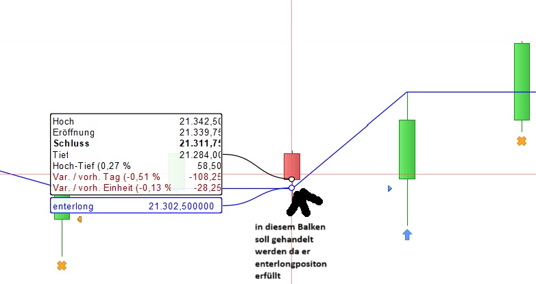 enterlongindicator(blaue linie) ist die Grenze für eine enterlong position . Wenn in dem jetzigen Balken open grösser ist als der enterlongindicator und dann das low kleiner ist als der enterlongindicator dann eröffne ich eine long position zum kurs von enterlongposition und schliesse die Position zum close.