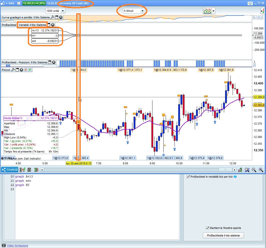 potrai vedere nel riquadro delle variabili i valori che hanno candela per candela. Tieni presente che la candela da monitorare è quella PRECEDENTE la candela dov’è c’è sopra o sotto la freccia, perché l’entrata avviene SEMPRE appena prima che la nuova candela si apra (le strategie sono sempre eseguite alla chiusura di ogni candela).