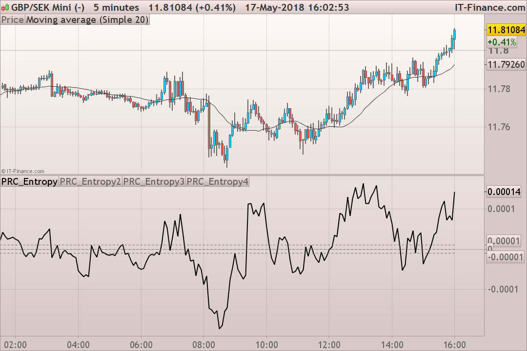 If we try to evaluate it according to its indicative attributes without paying much attention to its code, we will find out that it is an ordinary unnormalized oscillator and it is possible to apply to it all appropriate technical analysis methods. The indicator was presented in two variants – as a line (Entropy.mq5) and as a multicolored histogram (ColorEntropy.mq5).