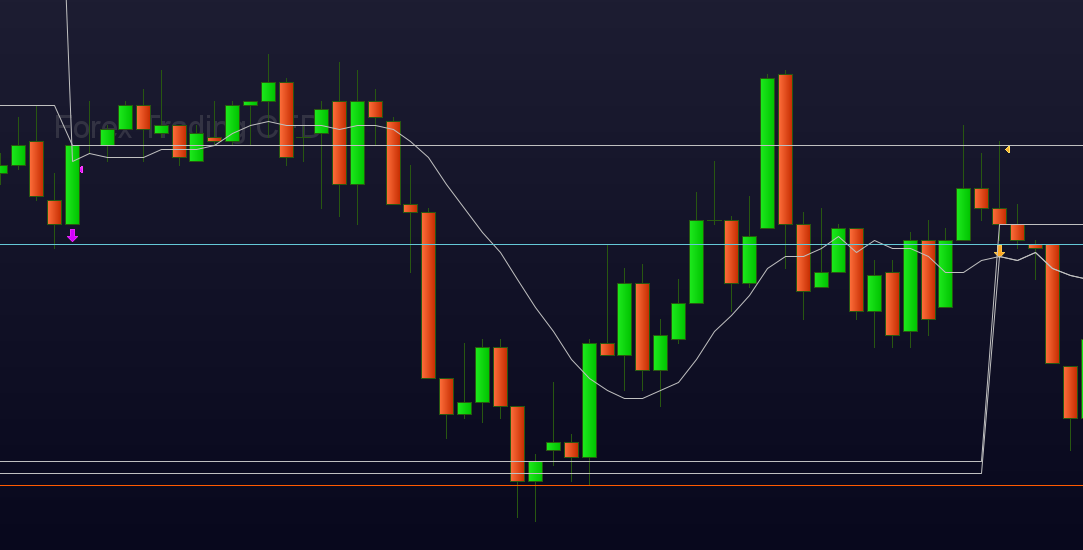 The purple down-arrow in the left hand side is yours. The yellow down-arrow in the right is mine. Notice that the pinbar I use is the bar prior to the bar prior to the entry. Thus, green in order to go short. Yours is red in order to go short, and I don’t think that is right. However, I personally go mad of upside-down thinking (what this requires) in general. Thus, the “I don’t think that is right” is actually not wrong, BUT see the 4th picture and try to wrap your head around why it is different. And why mine (yellow) looks better for start-off (keep in mind I use two bars to get to the decision).