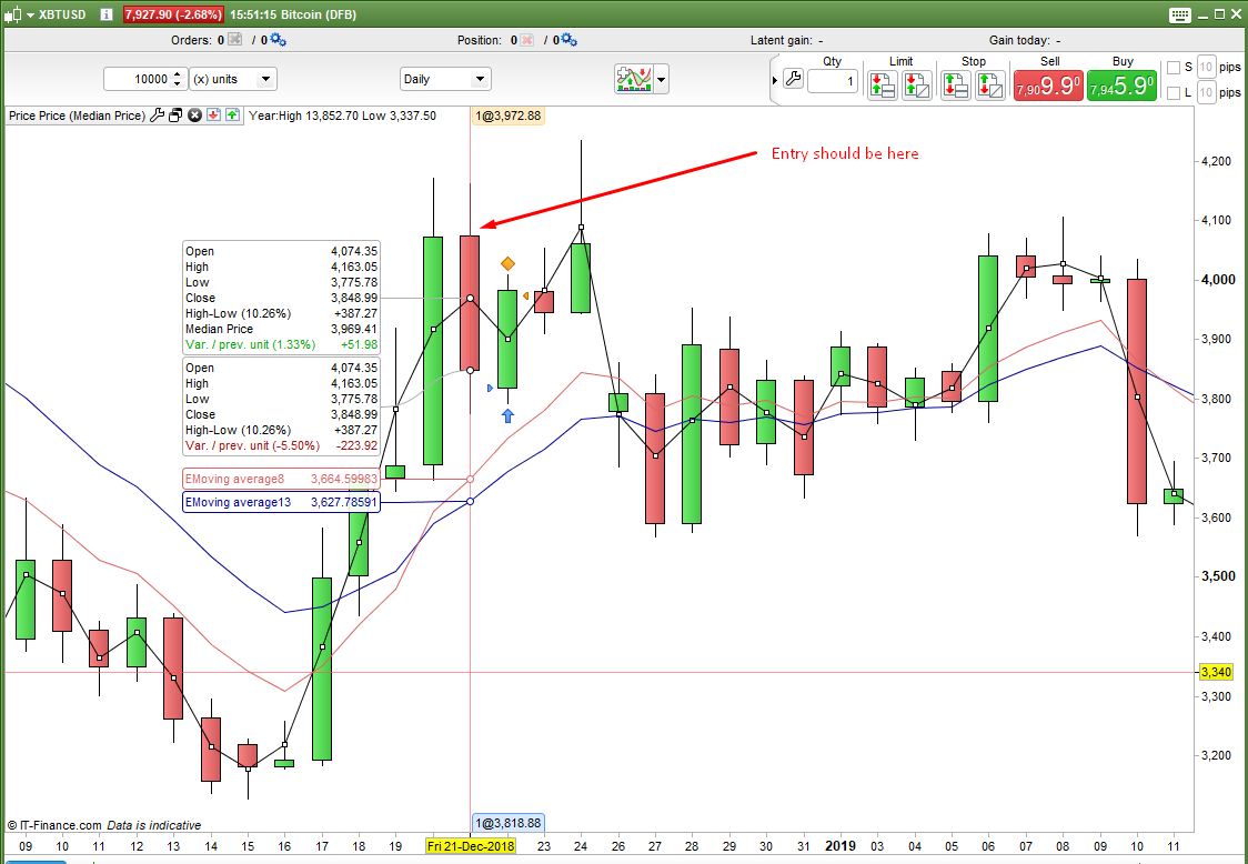 And now see the attached screengrab of where it actually enters. The entry is two-and-a-half bars after the line cross. Why does it not enter on the 20th or the 21st?