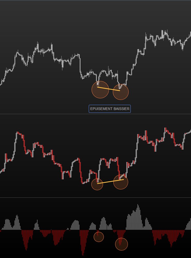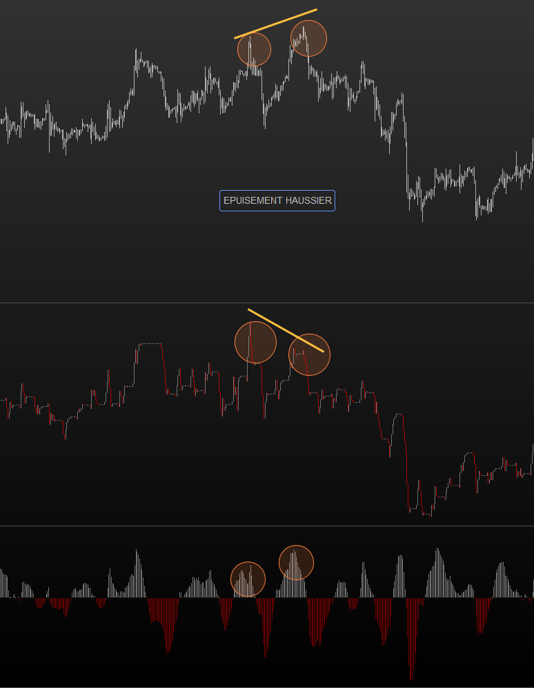 Donc, au doigt mouillé, j’ai repris la partie de ton code pour matérialiser les “Epuisements Haussiers”, que j’ai tenté de remodeler pour faire ressortir les “Epuisements Baissiers”. Résultat, j’ai tout cassé, plus rien ne fonctionne, plus rien ne s’affiche !!!