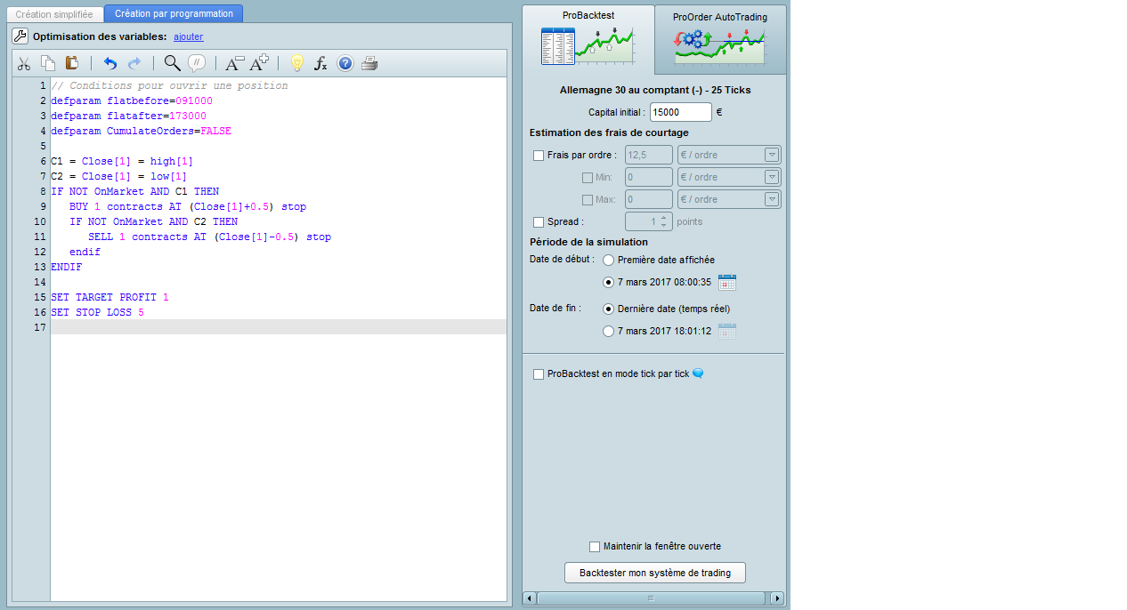Le principe :Dax 25 ticks; si la clôture est égale au plus haut/plus bas, prise de position sur la bougie suivante si dépassement (0.5 par exemple) du plus haut/plus bas (et donc de la clôture) de la bougie signal. TP à 1 et stoploss à 5.