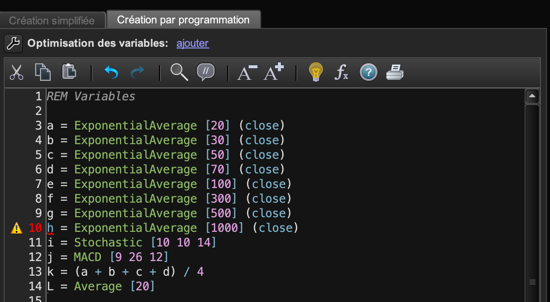 Après avoir rentré mes variables, une erreur est survenue… Il n’accepte pas le h = ExponentialAverage [1000] (close)