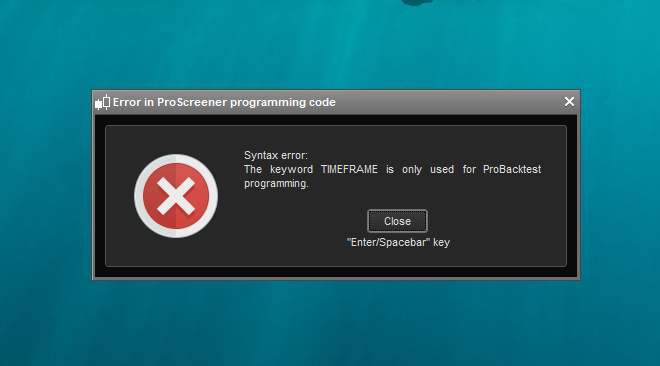 I have just used the Creation by Programming feature to try and form a new screener but get this error message. I have made quite a few screeners using the same word TIMEFRAME in them and never had this error box before. Help please? Thank you