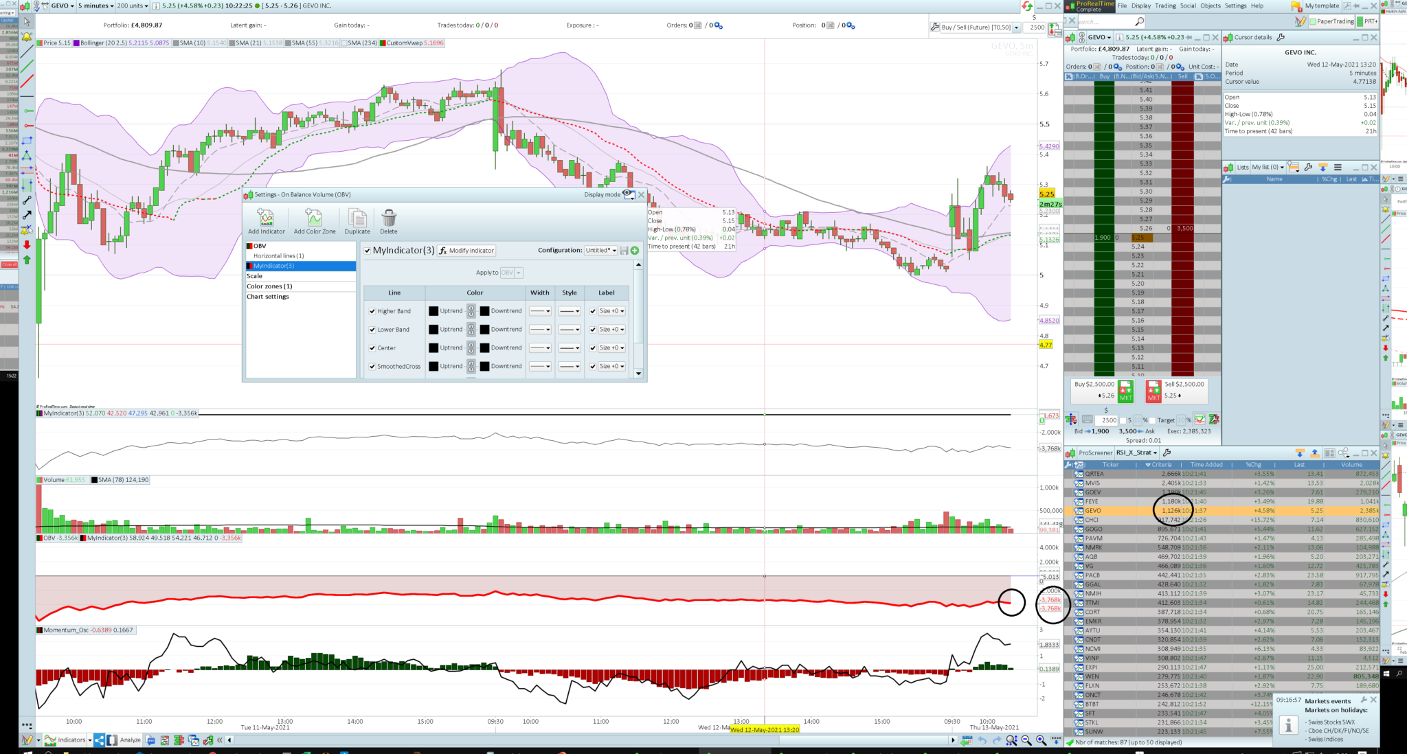 Indictor(3) is returned to the screener, and also plotted. The three circles show different values. The screener is saying obv(close) is positive, the chart which is using the exact same indicator as the screener is saying it is -3k
