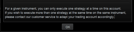 In text: For a given instrument, you can only execute one strategy at a time on this account. If you wish to execute more than one strategy at the same time on the same instrument, please contact our customer service to adapt your trading account accordingly.
