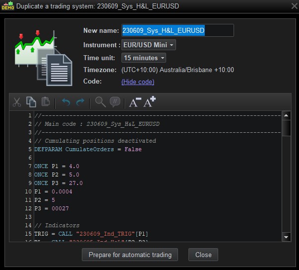 If I enter the values in the actual code the automatic trading preparation adds the variable parameters again. Obviously, this is wrong as we will have two sets of values for the same parameters – See in the attachment – “Prepared Code”.