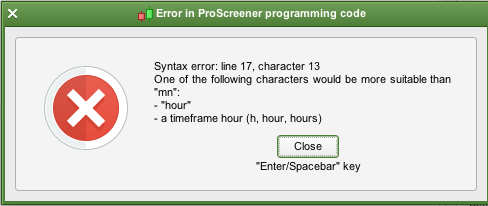 Dear All, error as attached occur when using code: TIMEFRAME(15mn)  Please advise on what it is and how to resolve?!