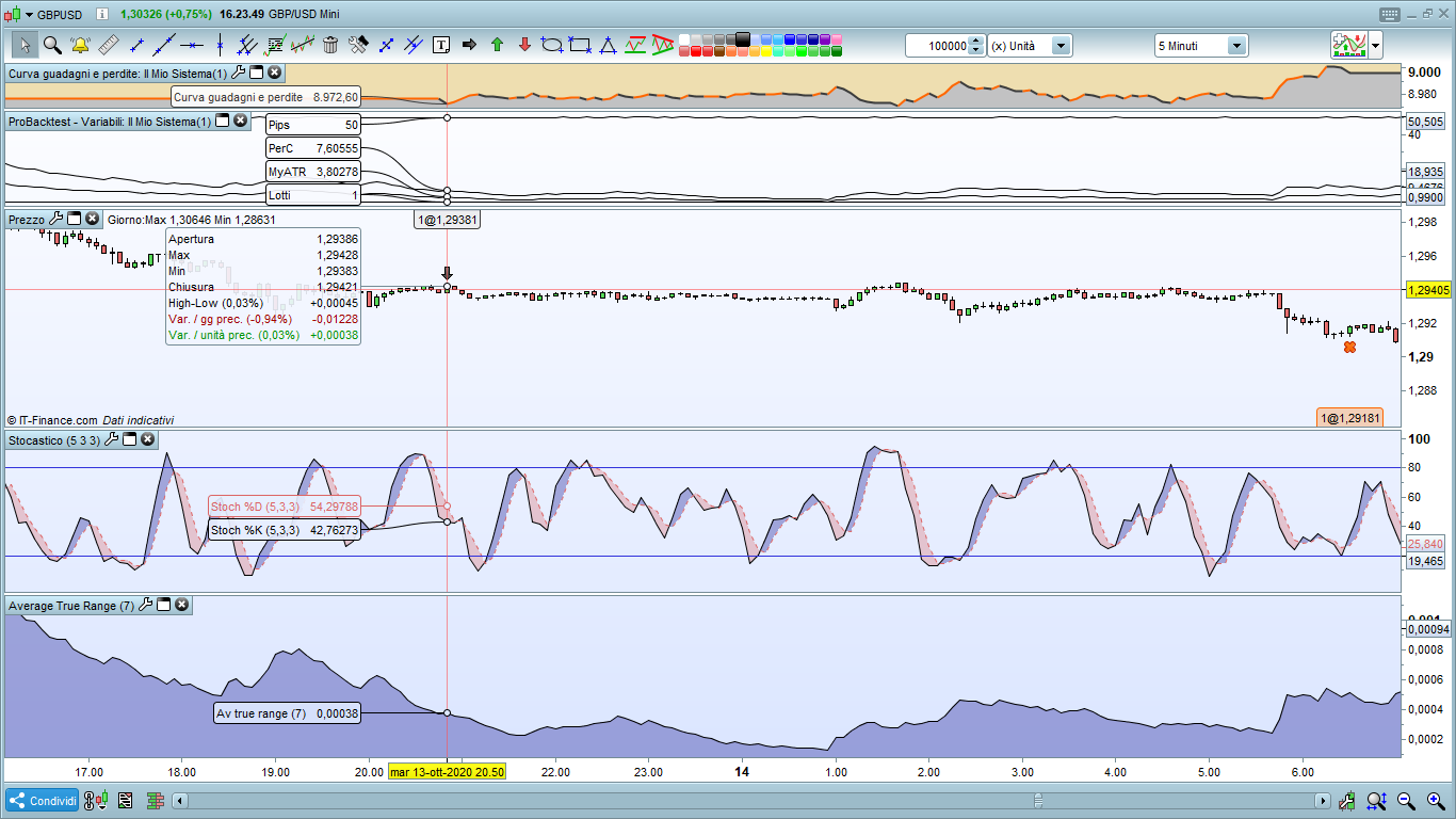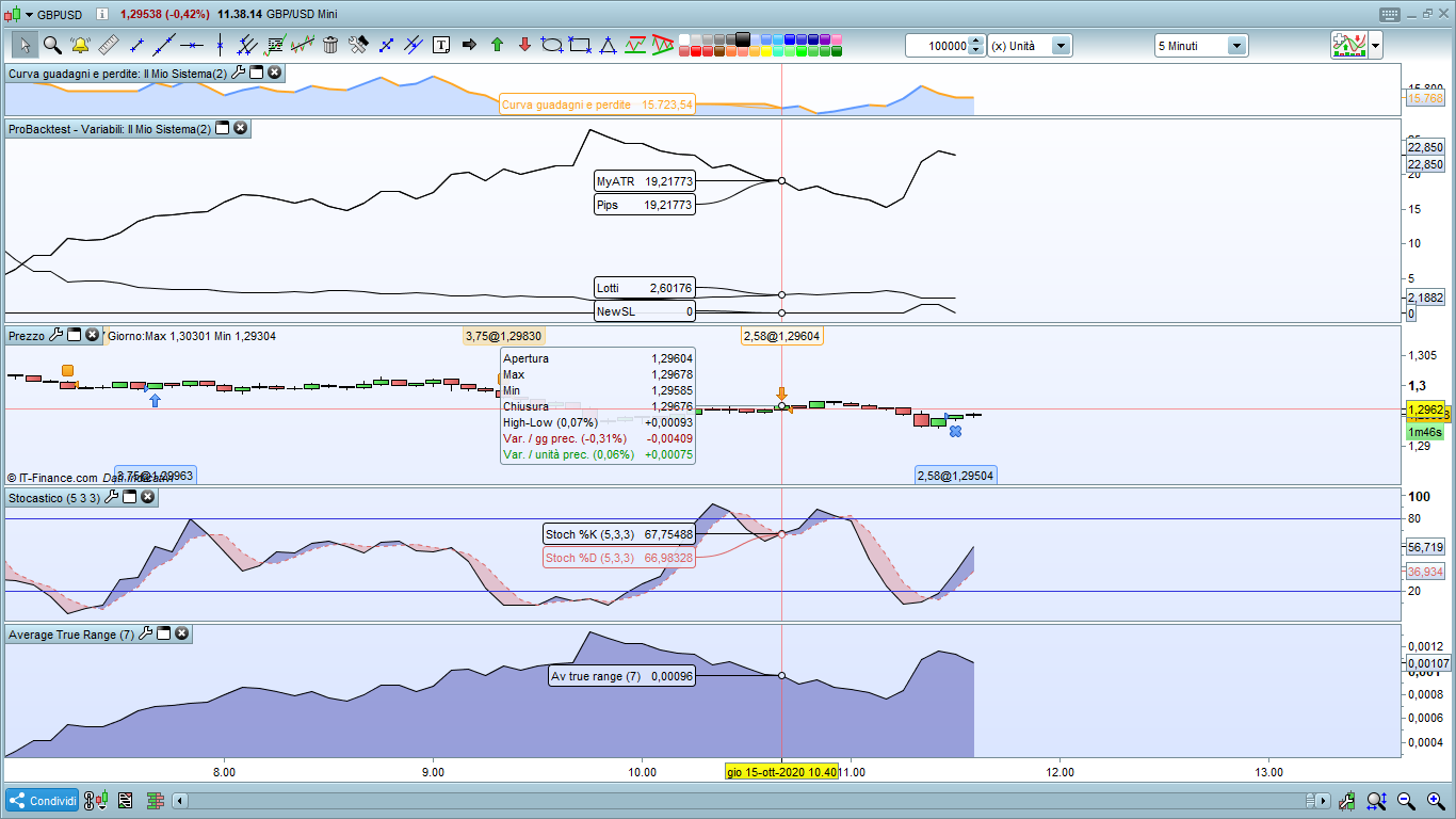 Si forse si è creata un po di confusione, io vorrei un atr di 7 periodi che mi definisca il mio stop loss che si a di 50 euro quindi atr=Sl=50 euro e il take profit 3 volte l’atr e quindi 150 euro, l’atr non deve seguire la posizione lo uso solo perchè mi serve solo il suo valore e basta, e vorrei andare ad agire sui lotti quindi per ogni posizione in cui viene definito lo stop loss ci sia un entrata di n.lotti per cui la perdita si aggiri a 50 euro e di conseguenza il guadagno di 150. Rispiego anche la strategia di ingresso, entrata in long quando la media esponenziale a 9 periodi incrocia verso l’alto la media esponenziale a 21 periodi nel time frame h1 e allo stesso tempo lo stocastico (settato 5,3,3) incrocia verso l’alto il valore 20, entrata short quando la media esponenziale a 9 periodi incrocia verso il basso la media esponenziale a 21 periodi nel time frame h1 e allo stesso tempo lo stocastico incrocia verso il basso il valore 80 in time frame 5minuti, spero di essere stato chiaro