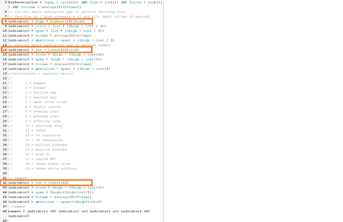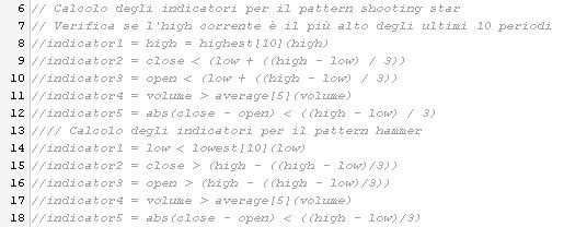 Screener di più condizioni123456789101112131415161718192021222324252627282930313233343536373839404142434445464748495051525354555657585960616263646566676869707172737475767778798081828384858687888990919293949596979899100101102103104105106107108109110111112113114115116117118119120121122123124125126127128129130131132133134135136137138139140141142143144145146147148149150151152153154155156157158159160161162163164165166167168169170171172173174175176177178179180181182183184185186187188189190191192193194195196197198199200201202203204205206207208209210211212213214215216217218219220221// restituisce i seguenti vslori://// Rialzo Ribasso inv.Rialz Inv.Ribas. Later.// U D u d L// 1 1 1 1 1// Trend medie mobili// 1 = Rialzo// 2 = Ribasso// 3 = Laterale//Sma5 = average[5,0](close)Sma20 = average[20,0](close)Rialzo = close > max(Sma5,Sma20)Ribasso = close < min(Sma5,Sma20)Laterale = ((close > Sma20) AND (close < Sma5)) OR ((close > Sma5) AND (close < Sma20))UP = RialzoDN = RibassoLat = Laterale// Calcolo del MACD personalizzatoMyMACD = Average[12](close) - Average[26](close)MySignal = Average[9](MyMACD)// Calcolo del Parabolic SARStep = 0.02Maximum = 0.2SARValue = SAR[Step, Step, Maximum]// Condizioni per il trendMACDLong = MyMACD > MySignalSARLong = close > SARValueMACDShort = MyMACD < MySignalSARShort = SARValue > High//stocastico lentoPeriodi = 10 // Numero di periodi per il calcolo del massimo e del minimoKp = 6 // Periodi per la media mobile di KDp = 3 // Periodi per la media mobile di DAvgType = 0 // 0=sma (media mobile semplice)IC = 75 // Soglia per l'ipercompratoIV = 100 - IC // Soglia per l'ipervenduto (25 se IC è 75)// Calcolo dei massimi e dei minimiHH = HIGHEST[Periodi](HIGH)LL = LOWEST[Periodi](LOW)// Calcolo dell'oscillatoreosc = (CLOSE - LL) / (HH - LL) * 100// Calcolo delle linee K e DLineaK = AVERAGE[Kp, AvgType](osc)LineaD = AVERAGE[Dp, AvgType](LineaK)// Definizione dei segnali di incrocio in zone di ipercomprato e ipervendutoIncrocioKSuD = LineaK CROSSES OVER LineaDIncrocioDKSu = LineaD CROSSES OVER LineaKCondL = IncrocioKSuD AND LineaK < IV // Segnale di acquisto quando K incrocia D verso l'alto in zona ipervendutoCondS = IncrocioDKSu AND LineaK > IC // Segnale di vendita quando D incrocia K verso l'alto in zona ipercomprato//bollinger rivistoBBVal = 5 // 5 periodi per le Bande di BollingerBBdev = 1.8 // 1.8 deviazione standard per le Bande di BollingerBBavg = average[BBval,0](close) // Calcolo della linea mediana delle Bande di BollingerBollUP = BBavg + ((std[BBval](close)) * BBdev) // Calcolo della banda superiore delle Bande di BollingerBollDN = BBavg - ((std[BBval](close)) * BBdev) // Calcolo della banda inferiore delle Bande di BollingerBullish = close > open // Condizione per identificare una candela rialzistaBearish = close < open // Condizione per identificare una candela ribassistaSma200 = average[200,0](close) // Calcolo della SMA a 200 periodiTrendUP = close > Sma200 // Condizione per un trend rialzistaTrendDN = close < Sma200 // Condizione per un trend ribassista// Condizioni per il segnale di acquistoL1 = Bullish AND Bearish[1]L2 = close[1] > BollDNL3 = low[1] <= BollDNCondL = TrendDN AND L1 AND L2 AND L3// Condizioni per il segnale di venditaS1 = Bearish AND Bullish[1]S2 = close[1] < BollUPS3 = high[1] >= BollUPCondS = TrendUP AND S1 AND S2 AND S3segnale = 0//breakout// Breakout RialzistaBreakoutRialzista = (HIGH = highest[10](HIGH)) AND ((HIGH - LOW) = highest[5](HIGH - LOW)) AND (VOLUME > average[5](VOLUME)) AND (CLOSE > (HIGH - ((HIGH - LOW) / 4)))// Breakout RibassistaBreakoutRibassista = (LOW = lowest[10](LOW)) AND ((HIGH - LOW) = highest[5](HIGH - LOW)) AND (VOLUME > average[5](VOLUME)) AND (CLOSE < (LOW + ((HIGH - LOW) / 4)))//volatilita breve e medio termine// Calcolo della volatilità di breve/brevissimo termine e di medio termineVolatilitaBreve5 = STD[5](log(close / close[1]))VolatilitaBreve10 = STD[10](log(close / close[1]))VolatilitaMedio100 = STD[100](log(close / close[1]))// Verifica delle condizioni di compressione della volatilitàCompressioneVolatilita5 = (VolatilitaBreve5 / VolatilitaMedio100) < 0.50CompressioneVolatilita10 = (VolatilitaBreve10 / VolatilitaMedio100) < 0.50// Calcolo del range per la barra correnteRangeCorrente = high - low// Inizializzazione del MinRange6 al range di 6 giorni fa per iniziare il confrontoMinRange6 = high[6] - low[6]// Confronto per trovare il minimo rangeMinRange6 = MIN(MinRange6, high[5] - low[5])MinRange6 = MIN(MinRange6, high[4] - low[4])MinRange6 = MIN(MinRange6, high[3] - low[3])MinRange6 = MIN(MinRange6, high[2] - low[2])MinRange6 = MIN(MinRange6, high[1] - low[1])// BoomerboomerOK = low > low[1] AND high < high[1] AND high[1] < high[2] AND low[1] > low[2]// Calcolo degli indicatori per il pattern doubleinsideindicator1 = high < High[2]indicator2 = high[1] < high[12]indicator3 = low > high[2]indicator4 = low[1] > low[2]// Verifica del pattern doubleinsidedoubleinside = indicator1 AND indicator2 AND indicator3 AND indicator4// Swing HighSwingHigh = (high < high[1]) AND (high[1] > high[2]) AND (close < open)// Swing LowSwingLow = (low > low[1]) AND (low[1] < low[2]) AND (close > open)// Key Reversal High BarKeyReversalHigh = (open > close[1]) AND (high > high[1]) AND (close < low[1]) AND (volume > average[5](volume))// Key Reversal Low BarKeyReversalLow = (open < close[1]) AND (low < low[1]) AND (close > high[1]) AND (volume > average[5](volume))// Calcolo degli indicatori per il pattern shooting star// Verifica se l'high corrente è il più alto degli ultimi 10 periodiindicator1 = high = highest[10](high)indicator2 = close < (low + ((high - low) / 3))indicator3 = open < (low + ((high - low) / 3))indicator4 = volume > average[5](volume)indicator5 = abs(close - open) < ((high - low) / 3)// Calcolo degli indicatori per il pattern hammerindicator1 = low < lowest[10](low)indicator2 = close > (high - ((high - low)/3))indicator3 = open > (high - ((high - low)/3))indicator4 = volume > average[5](volume)indicator5 = abs(