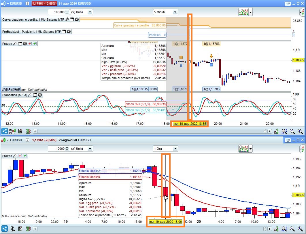 Nella foto dei due grafici messi insieme si vede bene la sovrapposizione dei tempi. Col cursore fermo sulla candela oraria che apre alle 18, nel TF a 5 minuti si vede che ti viene evidenziata l’ultina candela a 5 minuti, quella che chiude alle 19 (ed si è aperta alle 17:55), mentre la parte grigiata è quella dell’intera ora coinvolta, che parte alle 18:00.