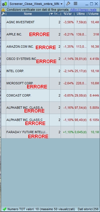 Ti riporto il risultato se vado a verificare la condizione dell’ombra massimo 5% del range non è verificata su quasi tutti i titoli