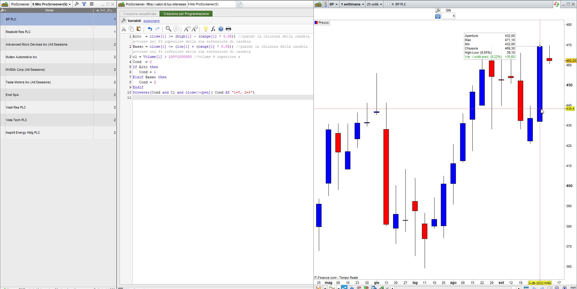Salve ho cercato di creare questo screener per trovare titoli, nel Time Frame Settimanale, che hanno chiuso la settimana scorsa con una shadow inferiore o superiore massima del 5% del range, il problema è che tra i risultati mi compaiono anche titoli con ombre maggiori del 5% e non capisco il perchè.