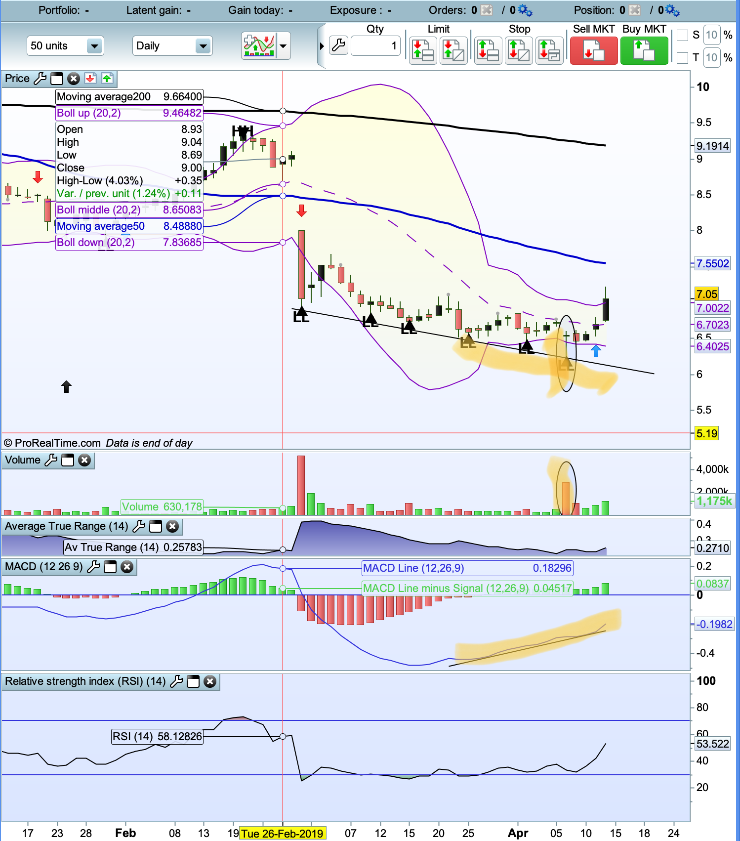 - bullish signal: the price is above the 50MA (bearish: the price is under the 50MA)