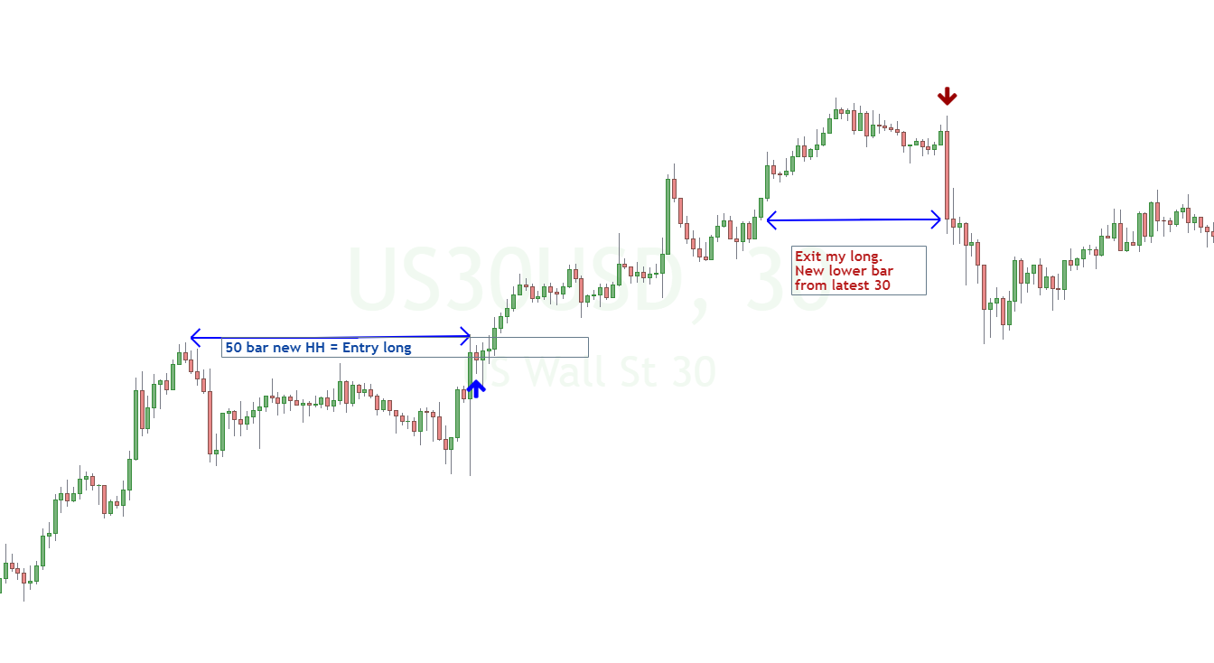 For an ex then latest bar is lower than the last 30 bars then sell position