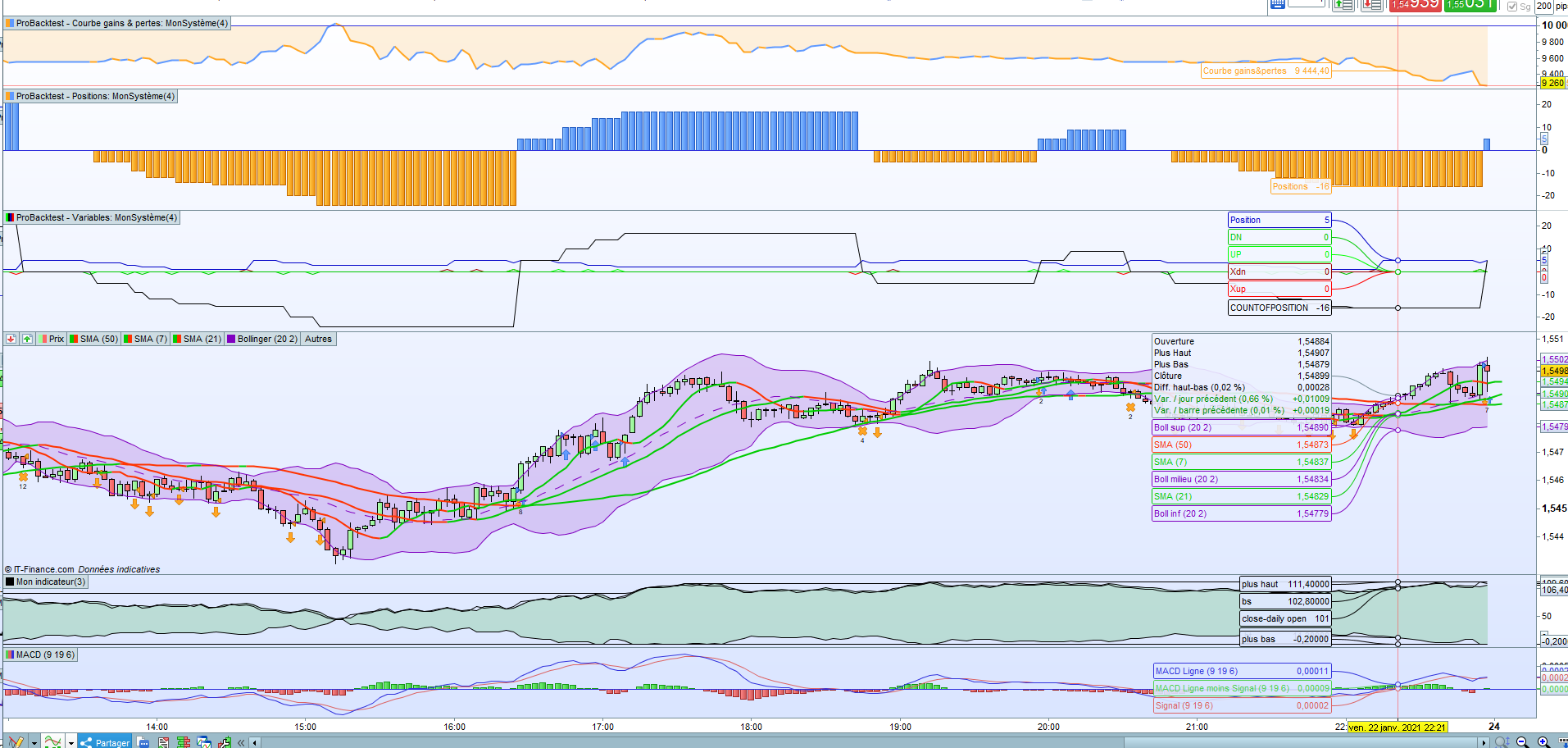 On the screenshot we see EURCAD 5min on Friday 22nd Jan at 16:15. At 16:10 the CCI crossed over the 100 line which is an exit short condition in this system. At 16:20 the Positions should have gone down to zero. on the user variables chart the blue variable Position (new entry size) is reset to initial value 5. The variable Xdn is set to 1 indicating an exit down criteria has been met, so the contents of the if condition should all be executed.