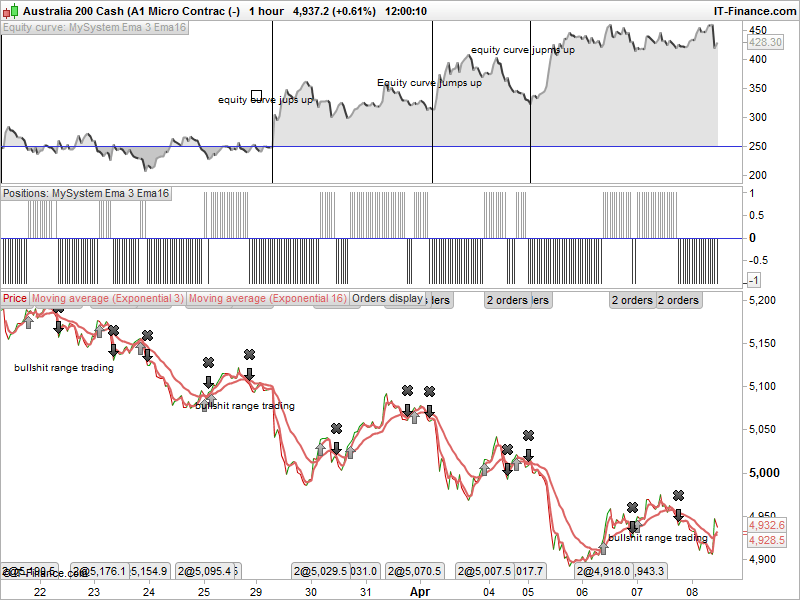 Ok Nicolas i,ve just written some code using 2 Exponential moving averages (3/16) but the back test confirm what i am trying to eliminate when the instrument i am trading goes sideways it all goes to shit…. how can i eliminate sideways trading and just capture the majors up and down trends? I have attached a backtest. This is the code