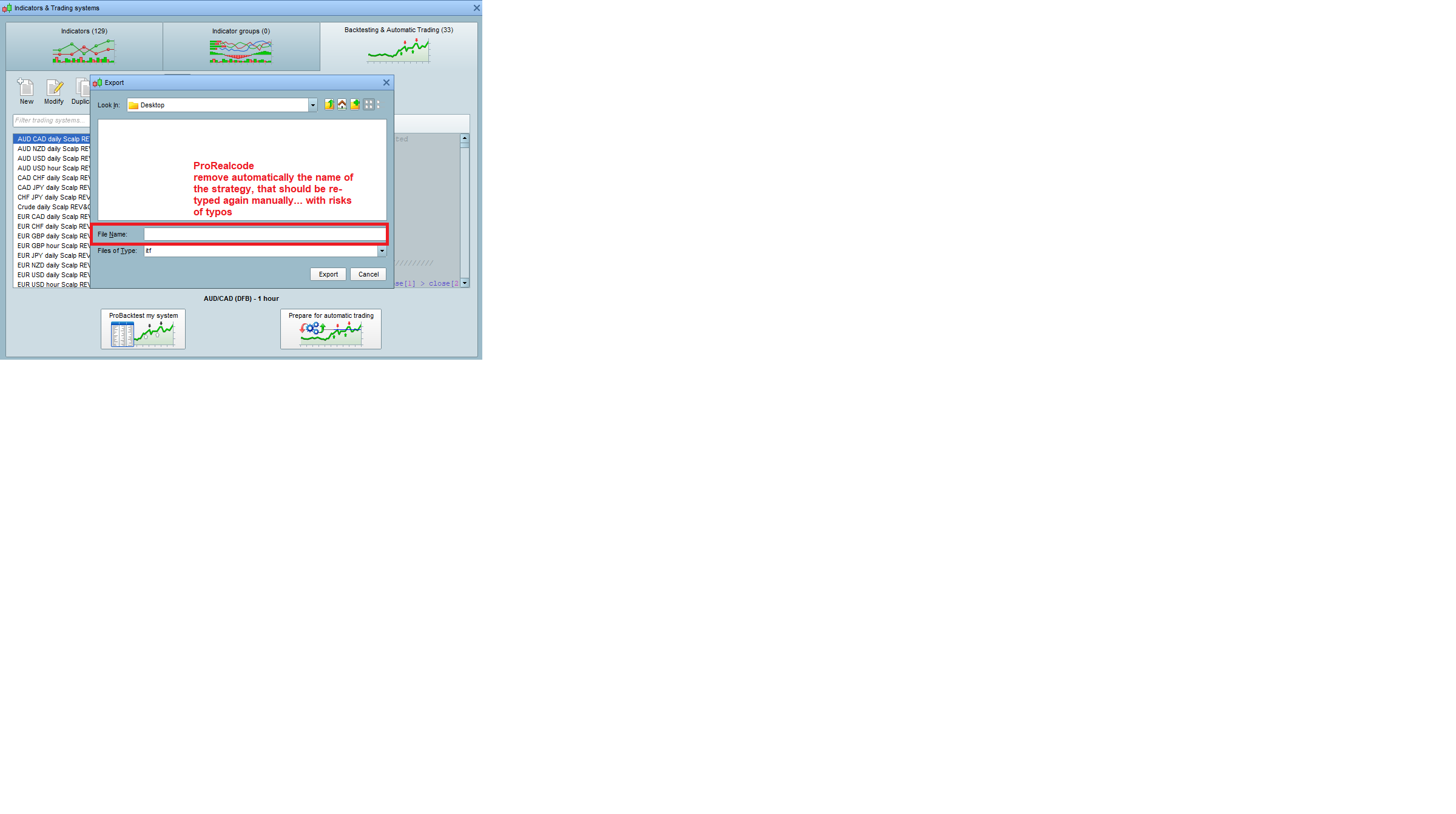 But this week in doing the usual passage, the name of the strategy in export is removed by ProRealcode and left the field blank; unless I re-type it manually the name (with a risk of making mistakes) I cannot save the program. Anybody faced the same issue – have an idea how to solve it?