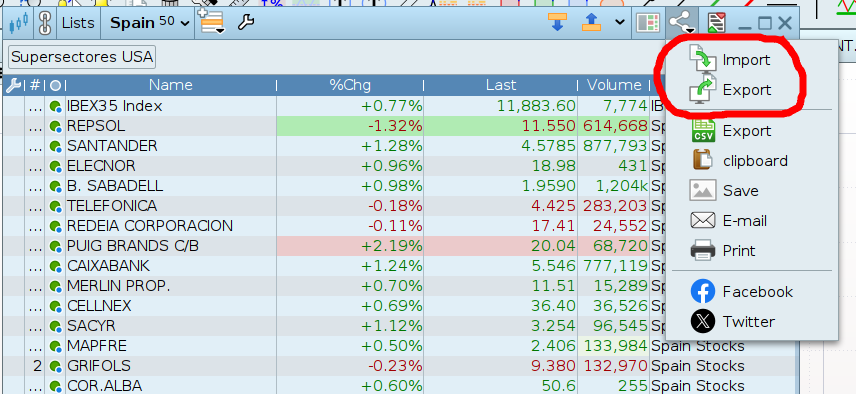 Bonjour, maintenant je ne me souviens plus si la V11 avait la possibilité d'exporter. Je ne pense pas… Dans la V12 vous avez la possibilité d'exporter dans le bouton de partage (voir capture d'écran). Dans tous les cas, ce que vous pouvez faire est de coller les tickers dans un .txt puis dans la V12 importer la liste à partir du .txt