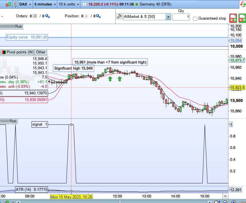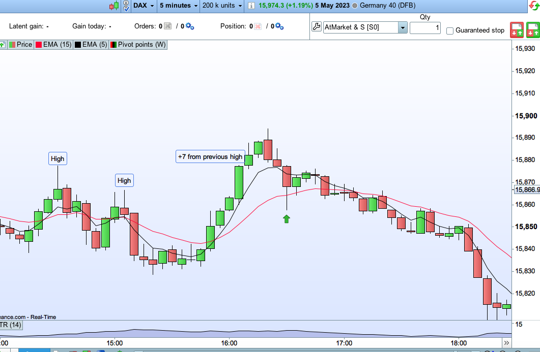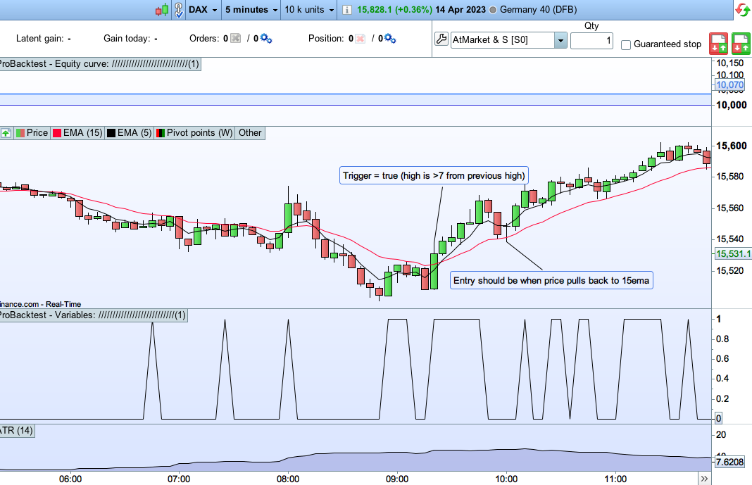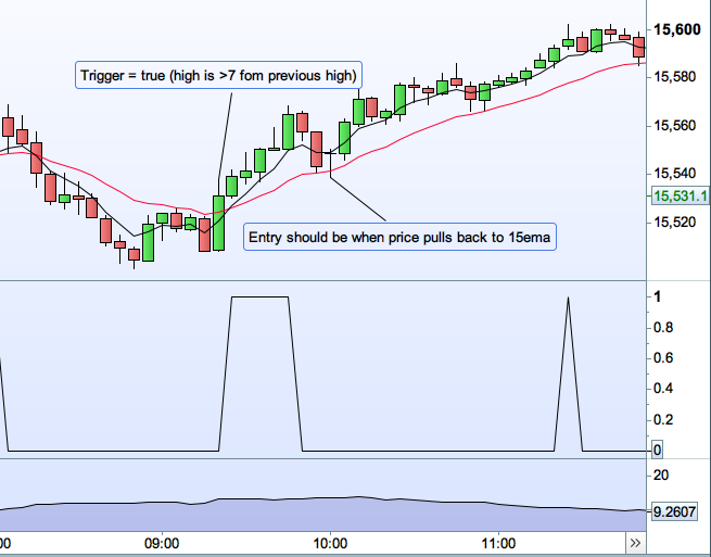 The problem is that ‘signal’ is currently derived from high[1], which is the previous bar. I don’t want to consider the previous bar. I want to consider the previous significant high with a look back. In the screengrab I have attached, I want ‘signal’ to become true on the bar where I have put the left green arrow. Once the signal becomes true, the green arrow to the right should then become an entry when the price pulls back to the 15ema.