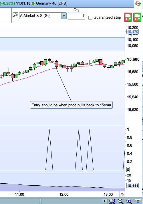 - Enter when price pulls back to 15ema