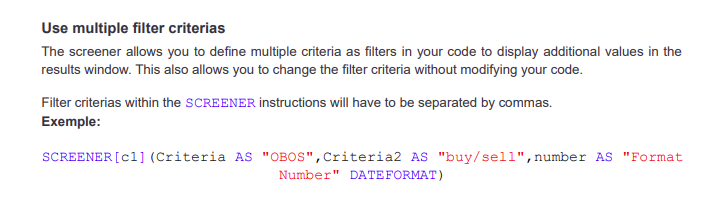 SCREENER[c1](Criteria AS “OBOS”,Criteria2 AS “buy/sell”,number AS “Format Number” DATEFORMAT)