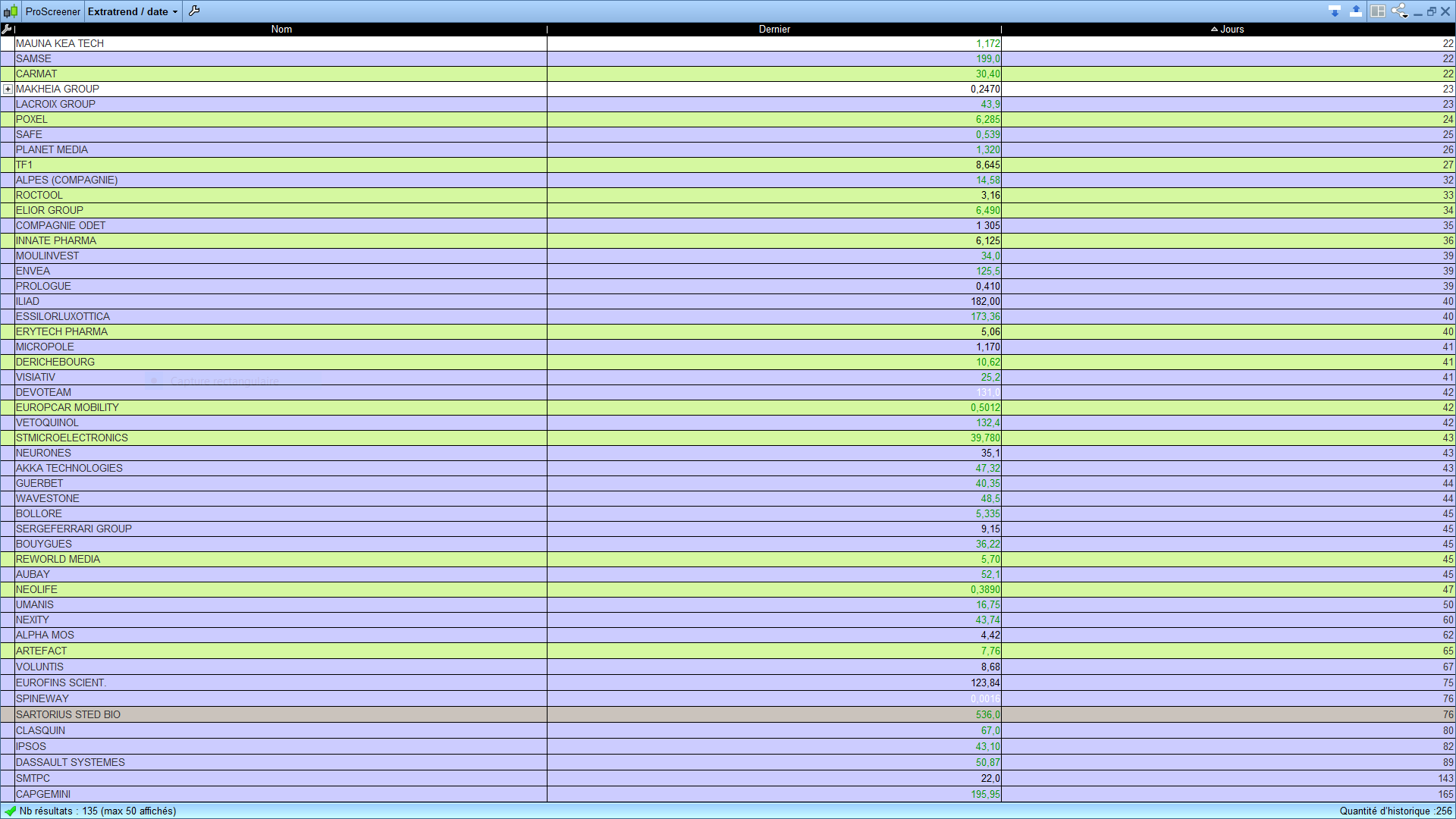 Afficher les valeurs avec ExtraTrend haussier, triées par nombre de jours (croissant ou décroissant, à vous de choisir):