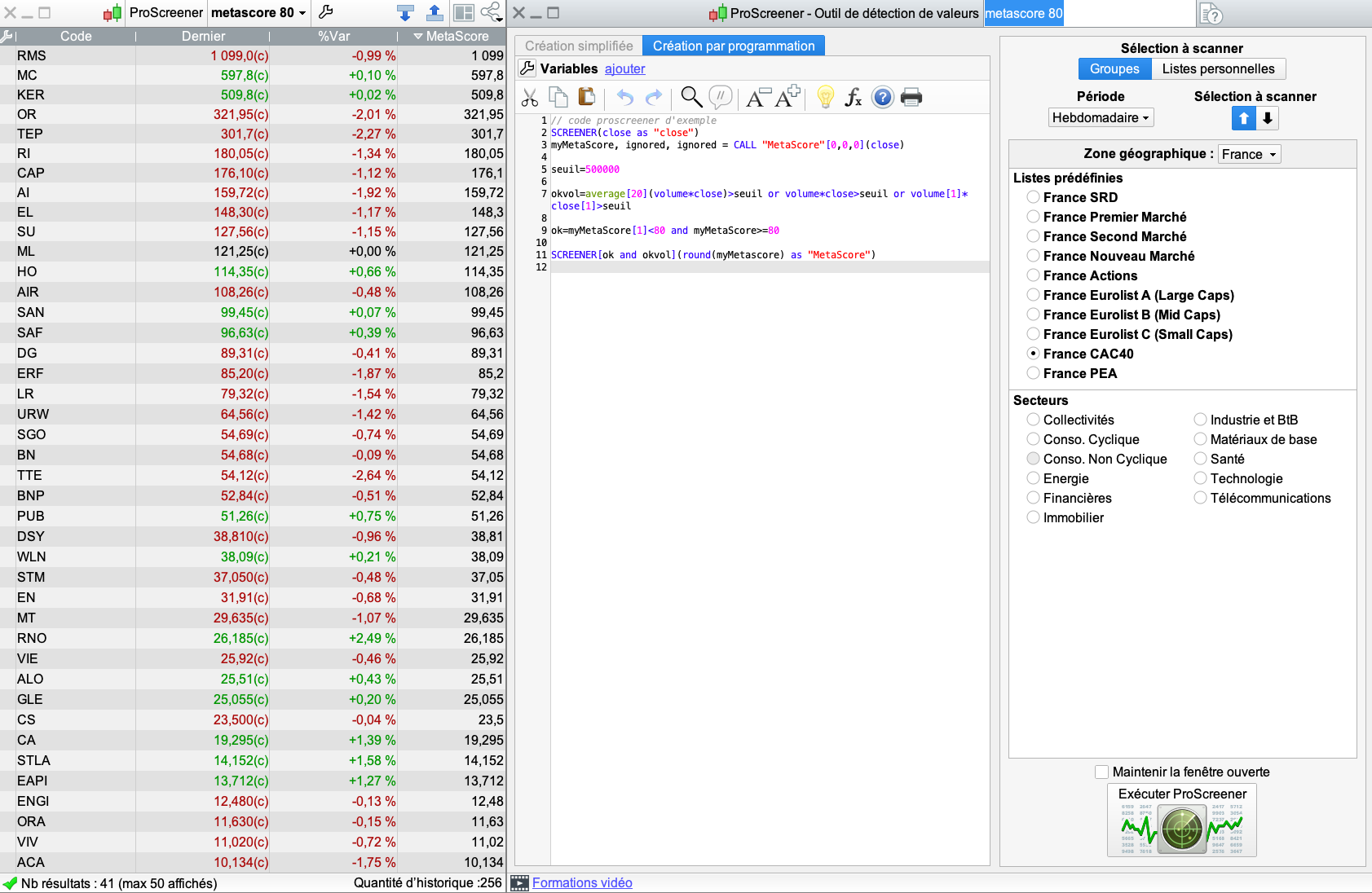 Merci pour ton retour. C’est confirmé. J’ai intégré ton programme pour vérifier la cohérence de nos deux listes. Conclusion à première vue il y a des soucis avec Proscreeners. A noter que sous la forme d’un indicateur tout fonctionne correctement. J’ai essayé sous la version 11 et 12 au cas où mais les résultats sont identiques. Ce n’est donc plus de notre ressort en espérant que l’assistance arrive à déverminer le problème. Encore merci et bonne soirée