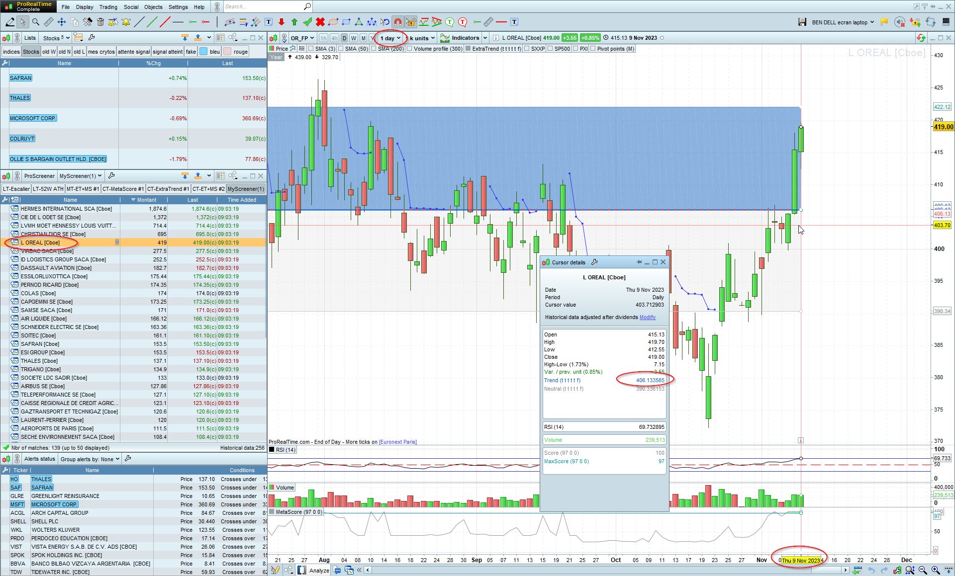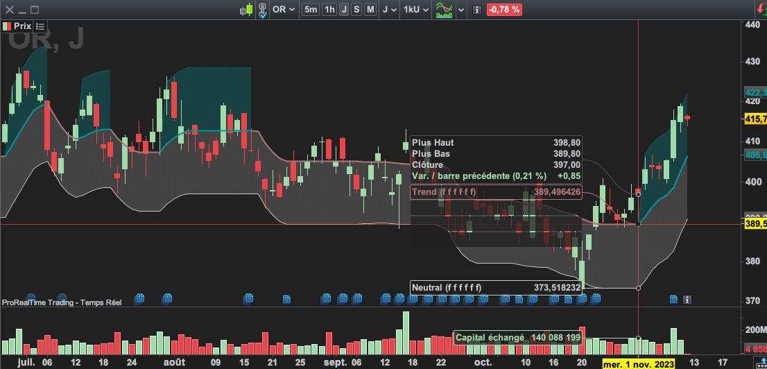 On voit bien sur tes graphs que la trend line est plate sur l’oreal à gauche mais on est dans une zone bleue. Le test myTrend>myTrend[1] ne devrait pas fonctionner pas pour détecter une zone bleue. J’ai plusieurs jours en sone bleue avec trend = 412.851877.