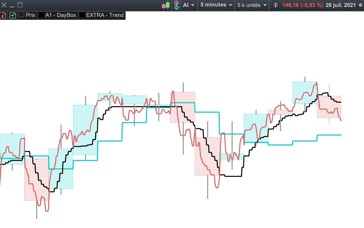Pour avoir plusieurs unités de temps sur un seul graphique, j’utilise une unité de temps basse de 5 minutes sur lequel j’applique 2 indicateurs. Un pour affiché le trend de l’ExtraTrend et un autre pour afficher les chandeliers journalier :