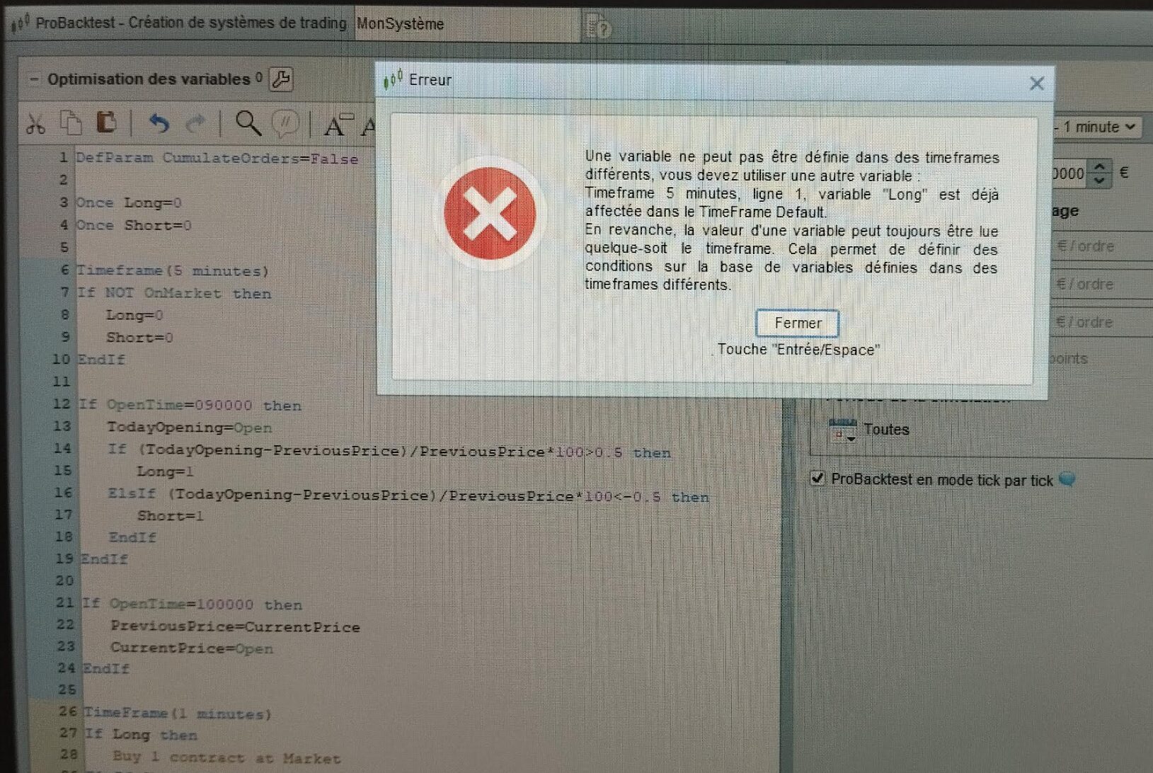 Pour faire fonctionner le code V2 je suis obligé d’effacer la ligne 6 pour qu’il fonctionne, cela n’a pas d’incidence sur le reste ? Car j’ai observé des erreurs de calcul de variation, certaines fois le robot à une variation inferieur a -0.5 donc devrait short mais il prend un long. Peut-etre est-ce du au fait que j’ai effacé la ligne 6 : Timeframe(5 minutes)