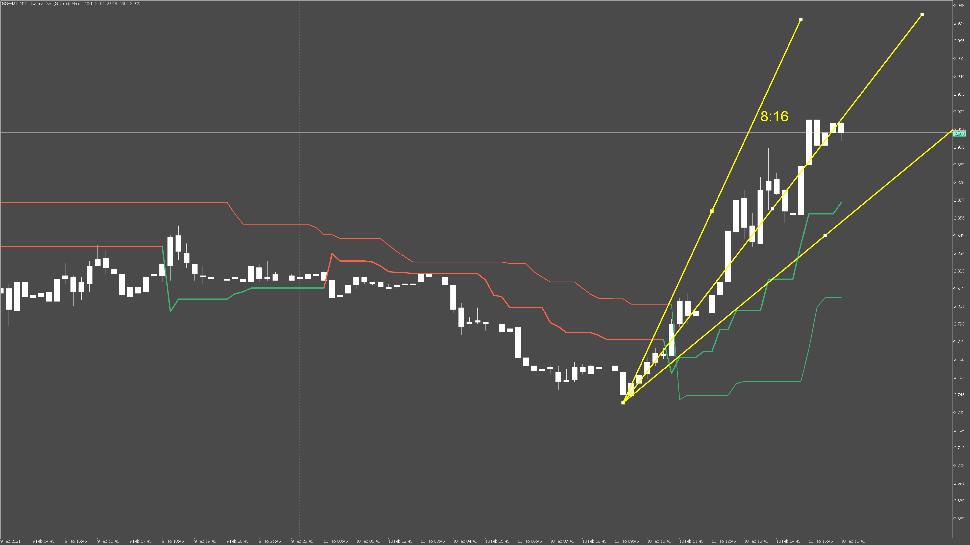 Se può interessarti esiste un metodo per “indovinare” (tra virgolette perchè in realta il prezzo va dove vuole e non si lascia catturare) dove andrà il prezzo. Queste linee di tendenza su henry hub natural gas le ho tracciate circa tre ore fa, ed il prezzo ha seguito la bisettrice delle due linee. Traccia le tendenze e la loro bisettrice. L’andamento ideale sarà la bisettrice, sotto la tendenza inferiore short e sopra long (presupponendo che sia già in posizione sono segnali di uscita o inversione)