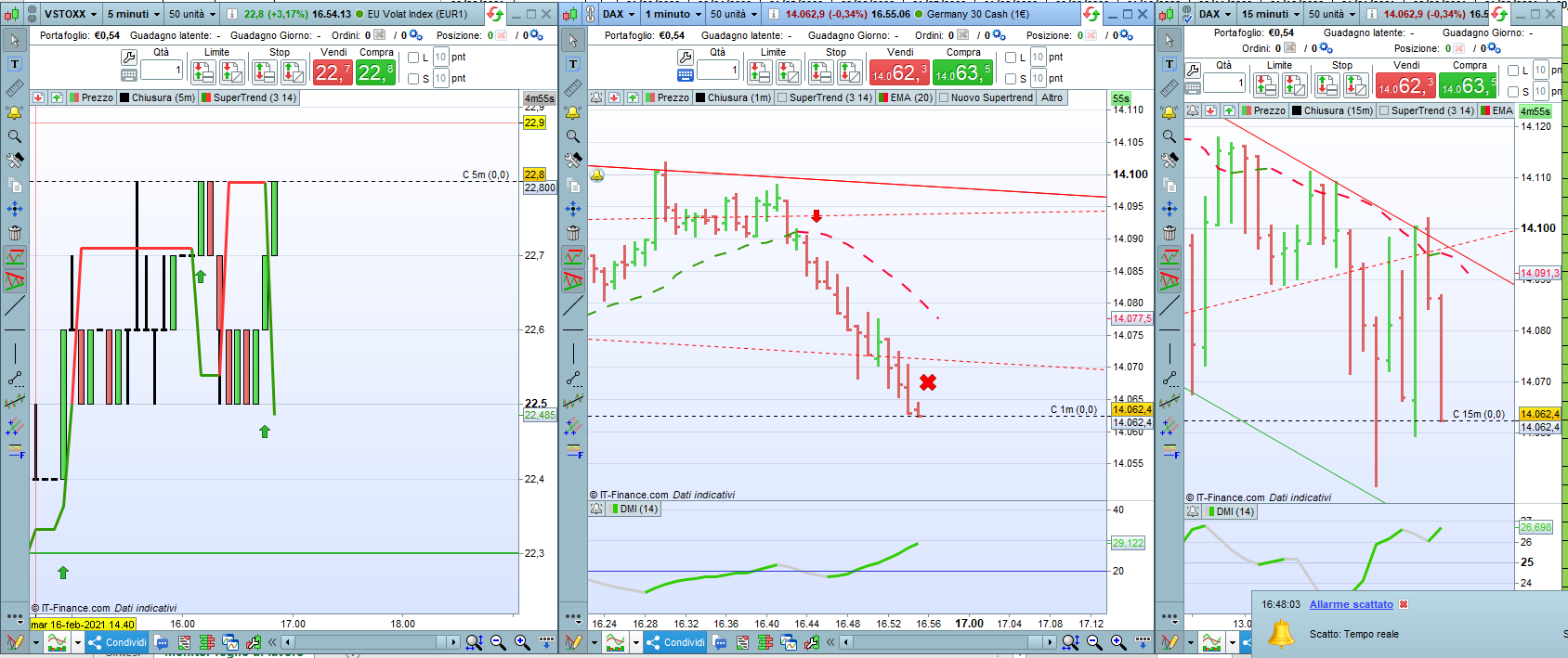 Apri un grafico del vstoxx 15 minuti e mettici un supertrend 10/3. la stessa cosa sul dax . Quando il supertrend del vstoxx è rosso appena il dax diventa verde vai long, quando il supertrend del vstoxx diventa verde appena il dax è rosso vai short, lascia perdere adx e cose simili, non ti aiuteranno mai un granchè. ciao.