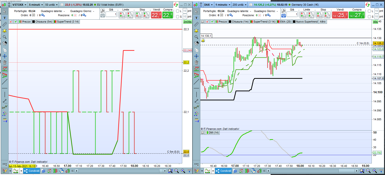 Fidati, sia il vstoxx che il dax a 15 minuti ti semplifica non poco la vita, li vedi muoversi in maniera opposta e sai il da farsi. Considera che il vstoxx misura la volatilità implicita delle opzioni a 30 giorni e ti da immediatamente la sensazione che il mercato vada in una direzione piuttosto che nell’altra.