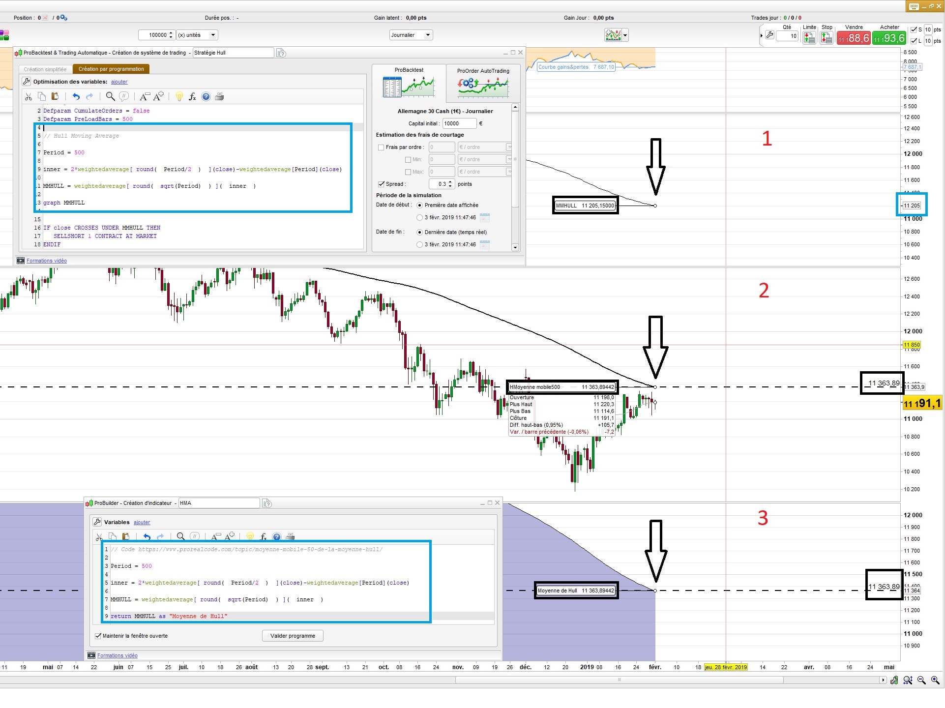 La capture d’écran montre sur la zone 2 la vraie HMA (500 pour ce test) en Daily sur le DAX qui retourne la juste valeur, puis sur la zone 3 le ProBuilder retournant la même valeur juste grâce au code à gauche trouvé sur le forum, et enfin, la zone 1, montre la fausse valeur de la HMA 500 et son code sur la gauche identique à celui du ProBuilder.