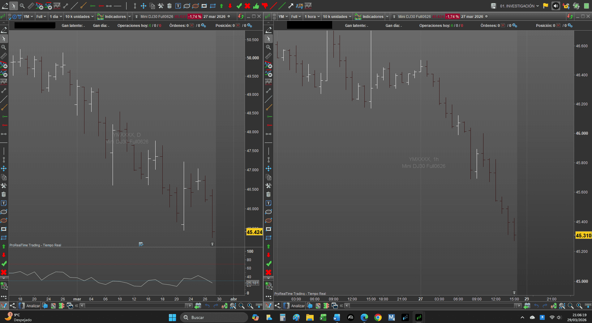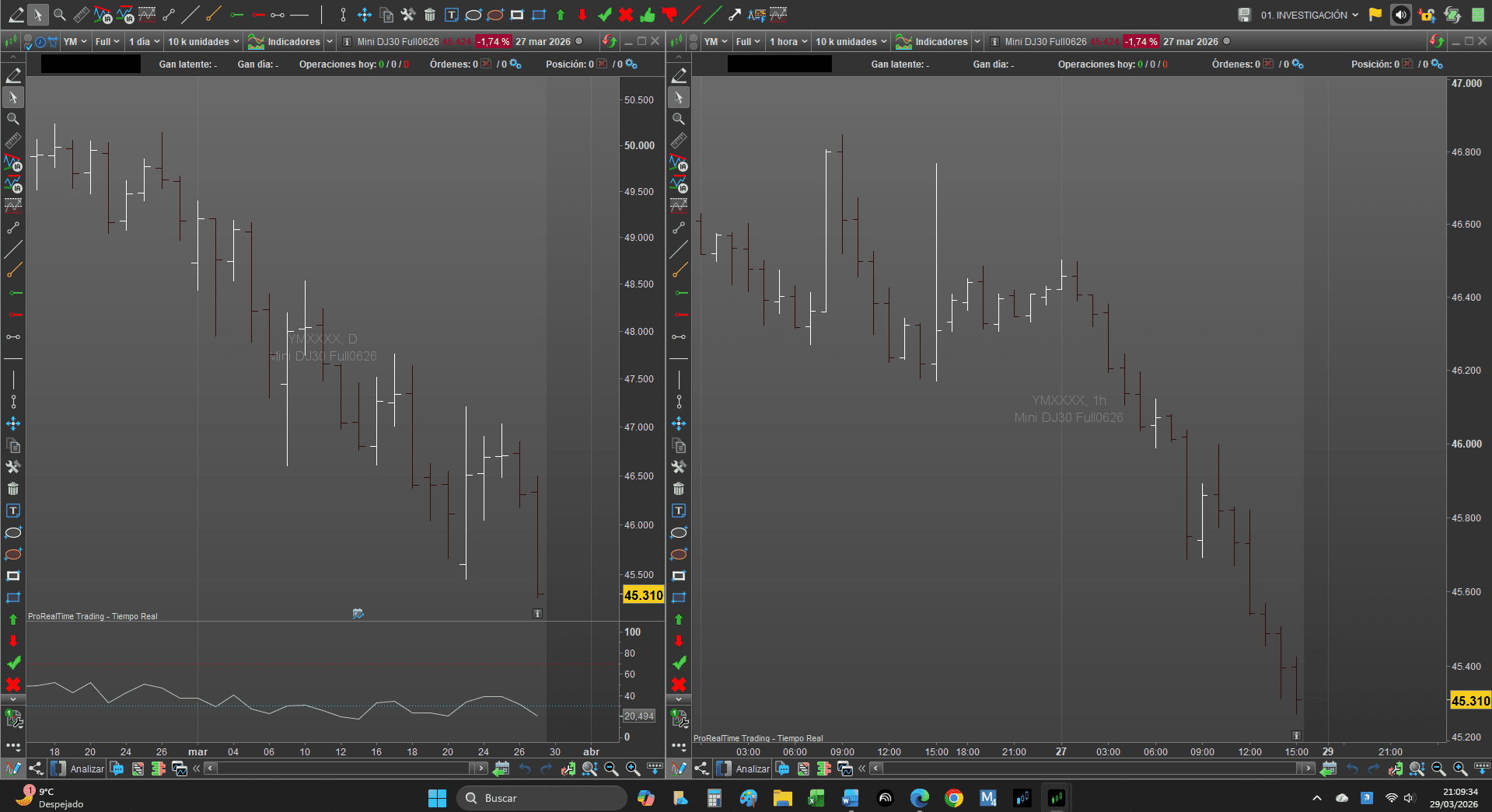 Adjunto dos capturas de pantalla del futuro del DowJones, tomadas con el mercado cerrado (antes de la apertura del mercado, el domingo 29 de marzo). en ellas se puede ver que el precio de cierre de una barra diaria “normal” no coincide con el precio de cierre en gráfico de 1H, mientras que el precio de cierre diario con info intradía, sí coincide con el del gráfico horario. Podríamos pensar que, para la creación de sistemas y cálculo de indicadores, es mejor utilizar los gráficos con información intradía, pero he podido comprobar que los backtests de los sistemas que he diseñado, utilizan barras “normales”; no barras con info intradía. Lo digo porque las señales generadas por los indicadores que he diseñado para confirmar esas señales, no coinciden con las operaciones mostradas en los backtests, si utilizo barras diarias con información intradía.