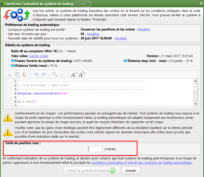En cliquant sur “start” pour démarrer un système de trading automatique préalablement préparé, la fenêtre ci-joint apparaît. Dans le champ “taille de position maximum”, on y indique la quantité de contrats max que le programme pourra lancer au marché. C’est une protection mais cela peut aussi limiter la fonctionnalité du programme si, par exemple, tu souhaites cumuler d’autres ordres alors que tu as renseigné 1 contrat maximum en lançant la stratégie.
