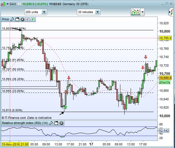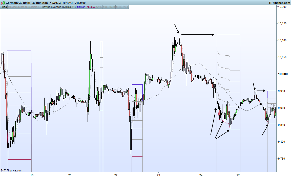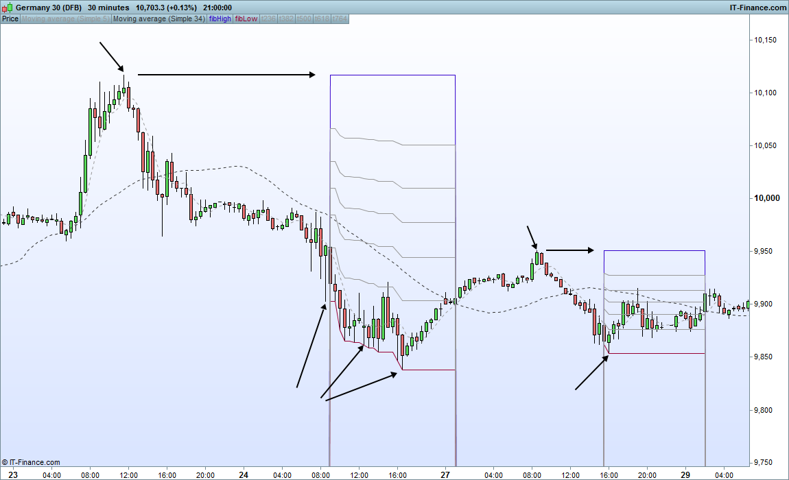 If this condition exists then fib levels created from low to high and we look for entry signal. In the “real world” we will look for the entry signal on various lower time-frames but as PRT won’t give this ability we can make some generalizations based on hit rate and probability analysis.