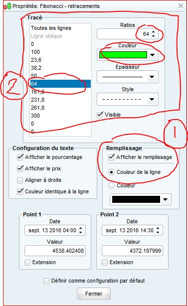 Ensuite, en zone (2) l’endroit où on peut modifier ses lignes, aussi bien en valeur (modifié le 61.8 en 64 pour illustrer même si c’est pas une valeur fibo) qu’en couleur, chaque ligne pouvant avoir une couleur différente si on les sélectionne une à une pour les modifier l’une après l’autre.