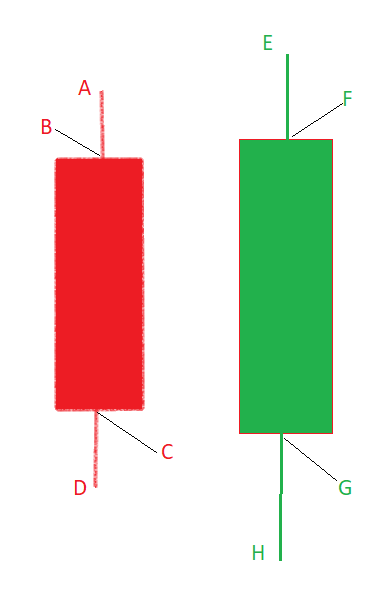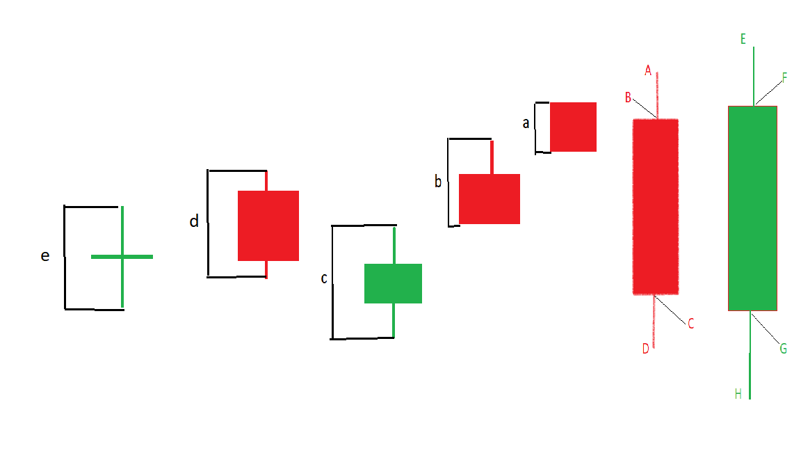 Esempio: ipotizziamo (vd. figura “esempio.png”) che EH (cioè il corpo + ombre di dimensioni maggiori tra le ultime 2 candele) sia di lunghezza 10, ed AD 9. La candela da prendere in considerazione tra le 2 più recenti sarà, quindi, EH. Deciso ciò, EH dovrà essere maggiore/uguale a ((a+b+c+d+e)/5) x 1,2).
