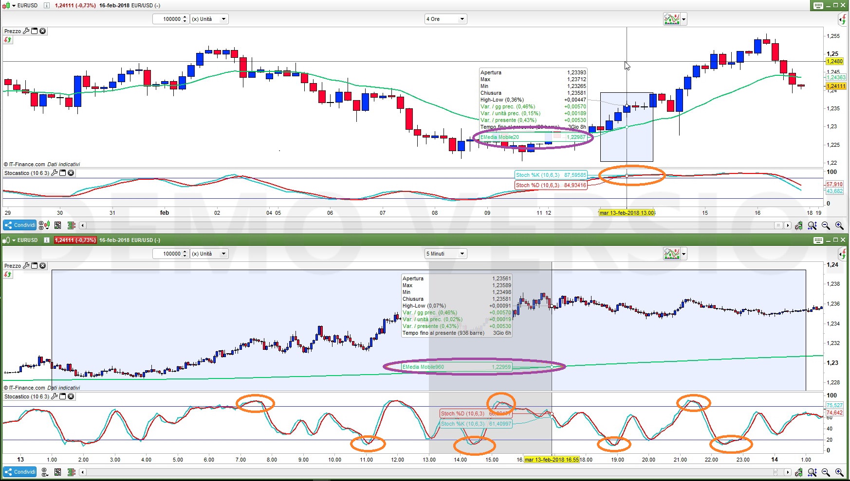 If you deal, as I did, also with Stochastic, you’ll notice that on the 4-hour chart it’s almost always above OB, while on the 5-minute chart it travels many times from north to south in the same amount of time!