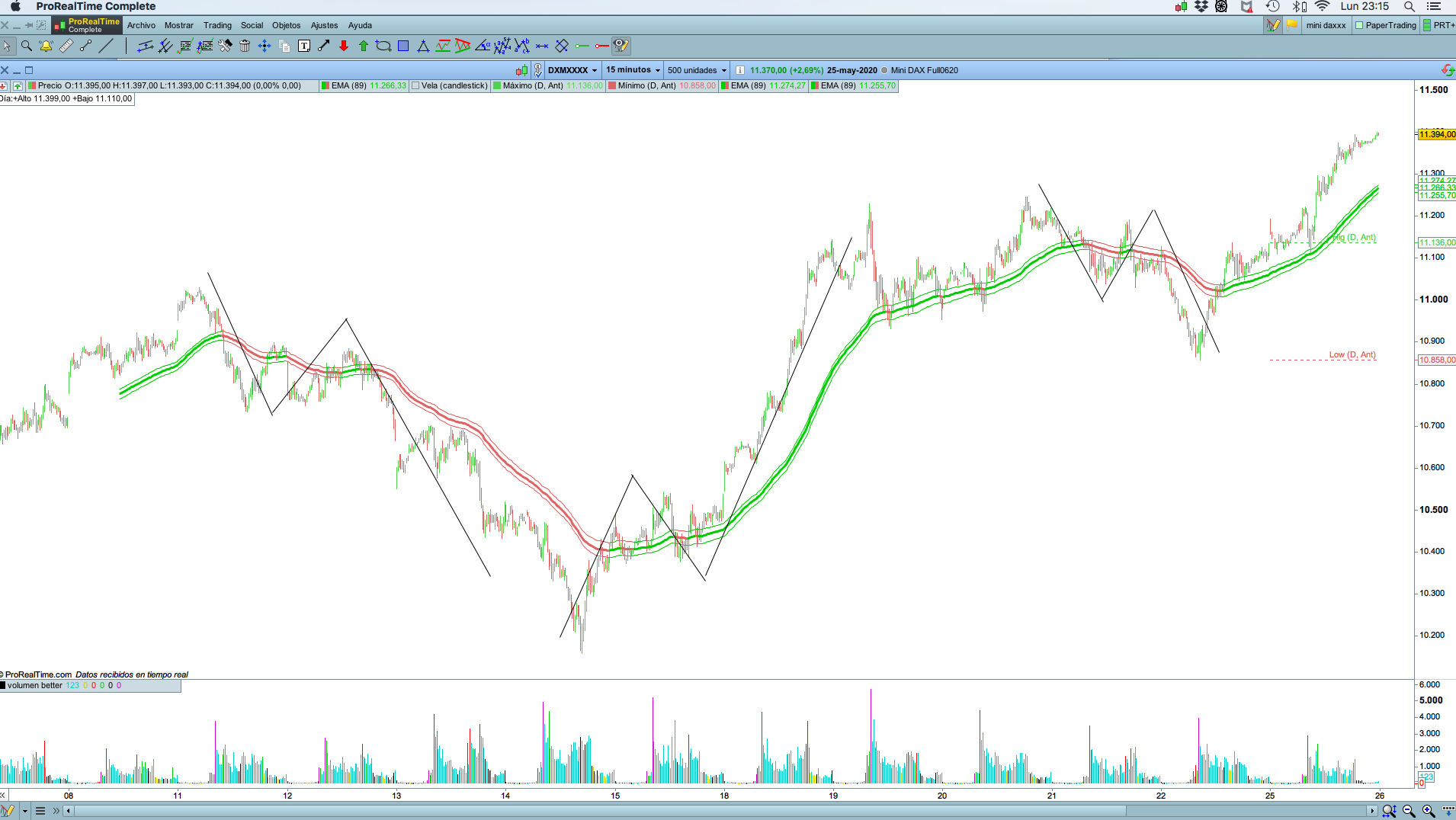 Buenas noches, mi objetivo es buscar 2º impulsos u onda 3 de Elliot (la mas jugosa). He comprobado que la Ema 89 sirve de indicador visual , ya que equivale al cruce de MACD por el nivel 0…..De manera manual compruebo que cuando el precio rompe por segunda vez la media móvil y ha dejado un mínimo creciente (en tendencia bajista previa) o un máximo decreciente (en tendencia alcista previa), el precio sale con fuerza y alcanza un 100% o 161% del 1º impulso. Le pongo varios ejemplo en la fotografía, muchas gracias.