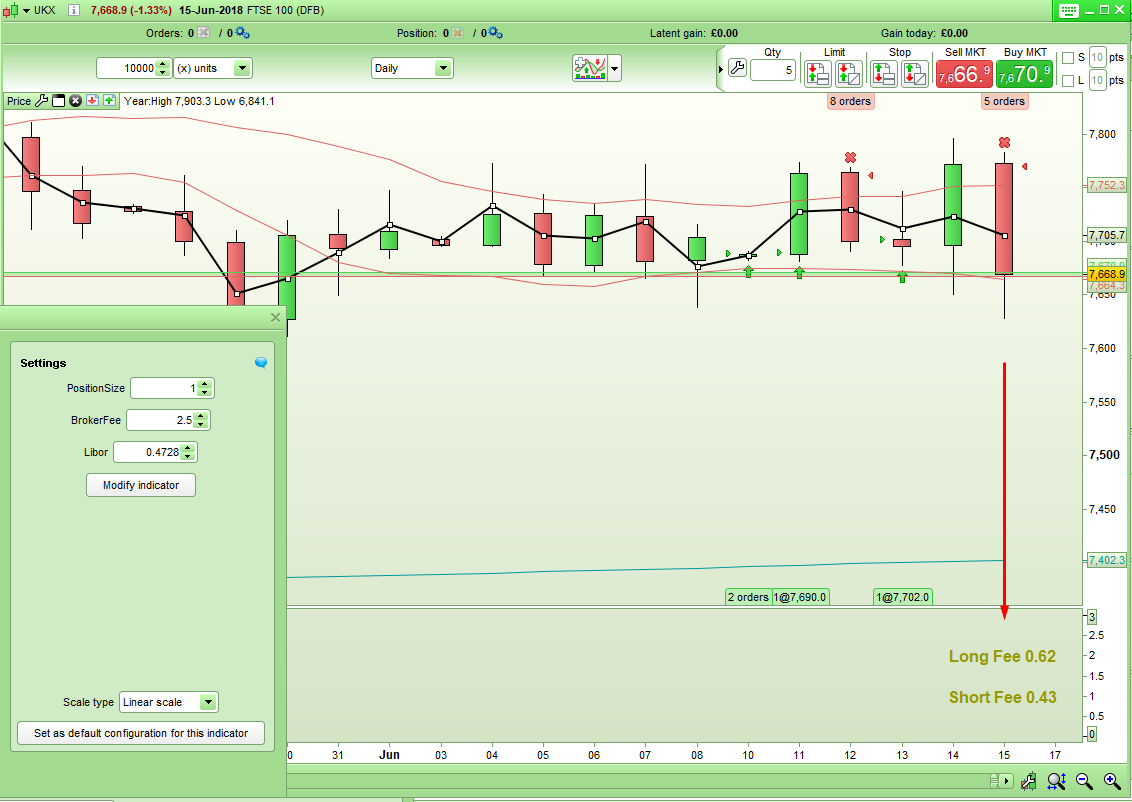 12345678910111213DEFParam CalculateonLastBars = 1//PositionSize = 1//BrokerFee = 2.5//Libor = 0.4728LongFee = Round(((PositionSize * close) * (((BrokerFee/100) + (Libor/100))/365))*100)/100ShortFee = Round(((PositionSize * close) * (((BrokerFee/100) - (Libor/100))/365))*100)/100DRAWTEXT("Long Fee #LongFee#",BarIndex, 2 ,SansSerif,Bold,16)coloured(153,153,0)DRAWTEXT("Short Fee #ShortFee#",BarIndex, 1 ,SansSerif,Bold,16)coloured(153,153,0)return 3,0ITF file attached.
